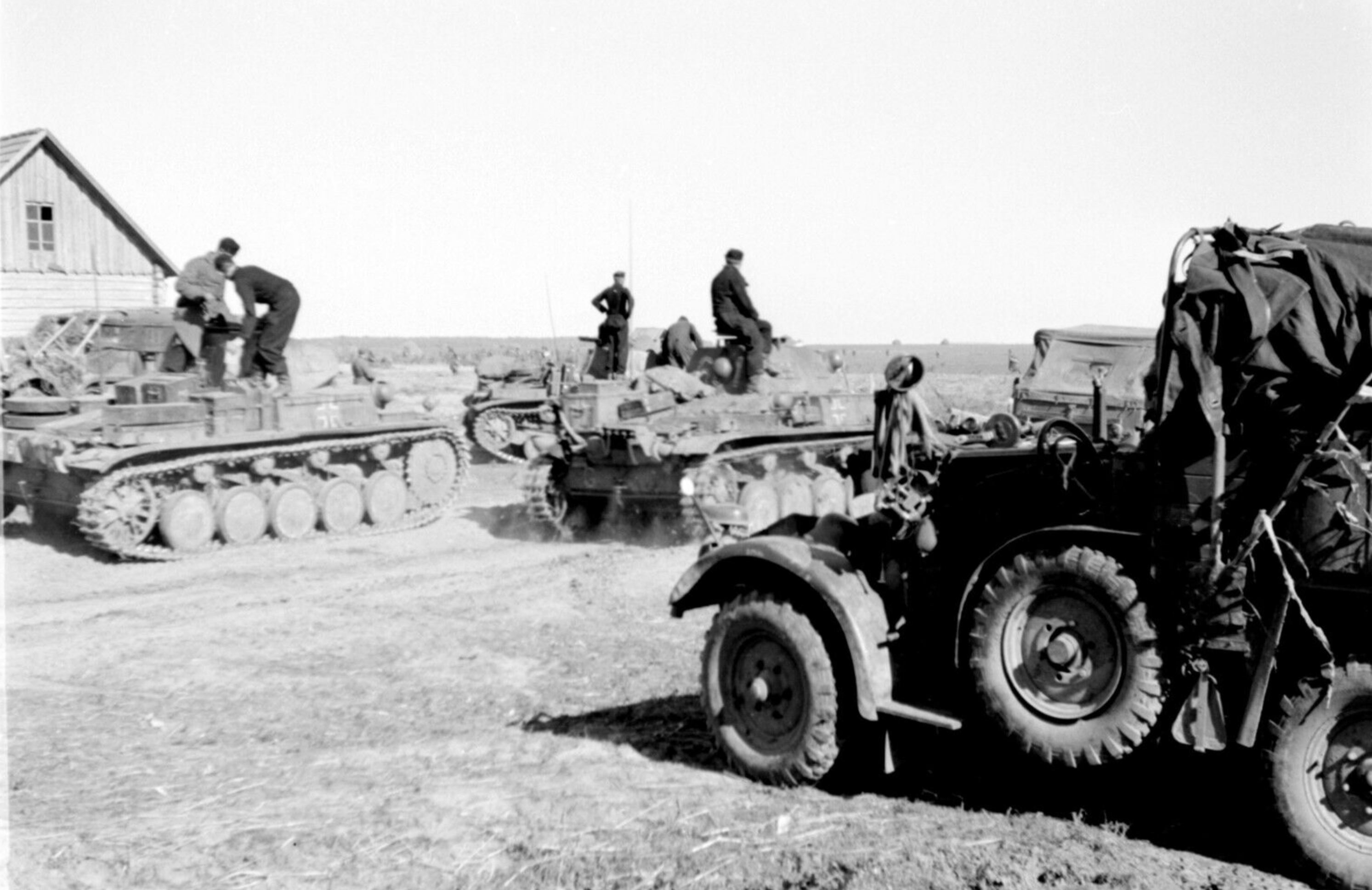 Танки Pz.Kpfw. II танковой группы «Гудериан» (Panzergruppe Guderian) во время остановки в советском населенном пункте в ходе летнего наступления вермахта. Справа в кадре армейский артиллерийский тягач «Крупп Протце» (Krupp Protze L2H143, Kfz.69)