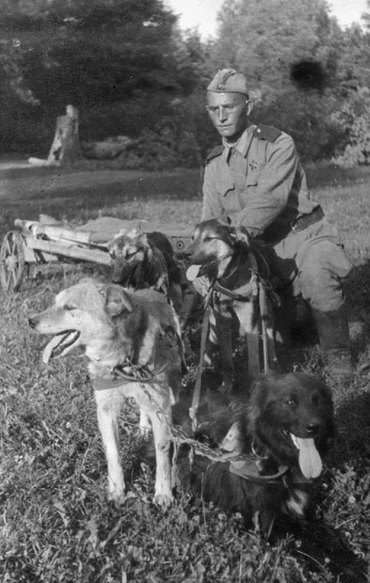 Вожатый 56-го отдельного отряда собак санитарно-нартовых упряжек красноармеец Ахмидула Негматович Фаткулин (1910 г.р.) с упряжкой ездово-санитарных собак.