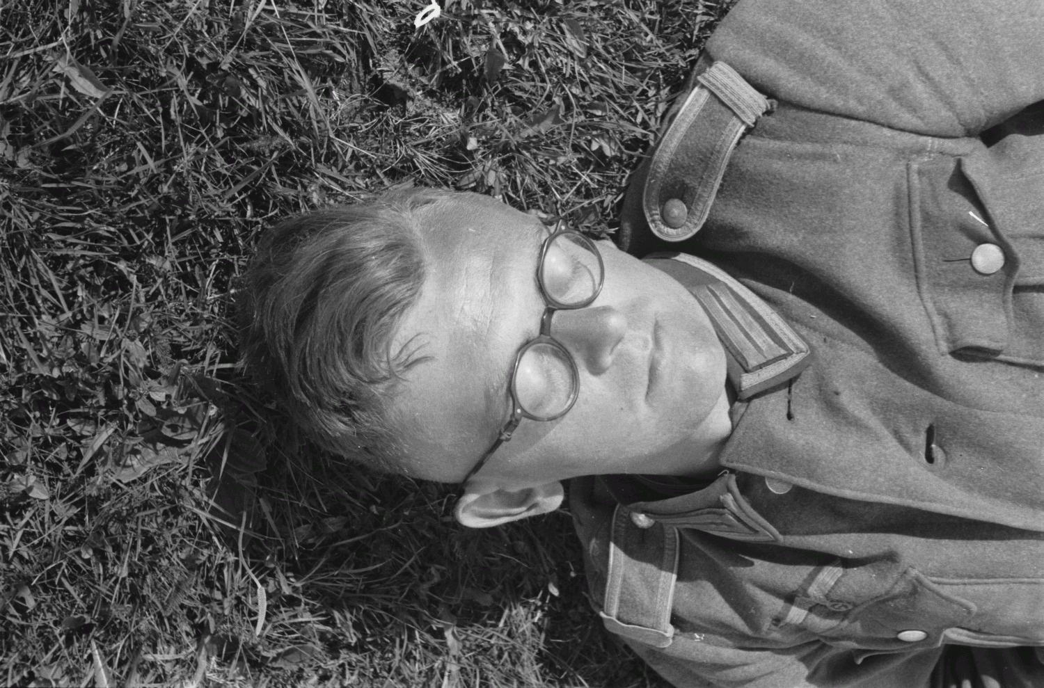 Унтер-офицер 167-й пехотной дивизии вермахта отдыхает, лежа на траве. Предположительно, снимок сделан в деревне в Курской области (ныне Белгородская область) весной-летом 1943 года, до боев на Курской дуге. Этот унтер-офицер есть и на другом снимке во время приема пищи.