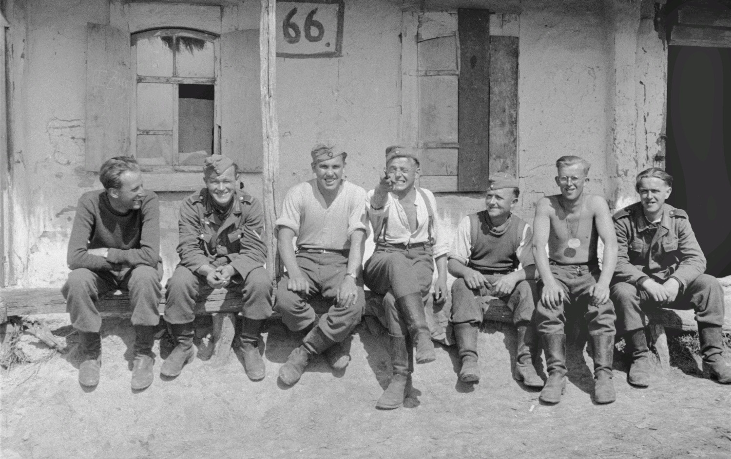 Групповое фото военнослужащих 167-й пехотной дивизии вермахта, отдыхающих возле сельского дома.