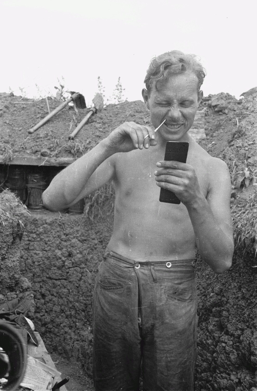 Рядовой вермахта Франц Грассер (Franz Grasser, 26.03.1911 — 13.11.1944) подстригает себе усы, стоя в окопе. Курская область (ныне один из районов Белгородской области). Предположительно, снимок сделан весной-летом 1943 года, до боев на Курской дуге.