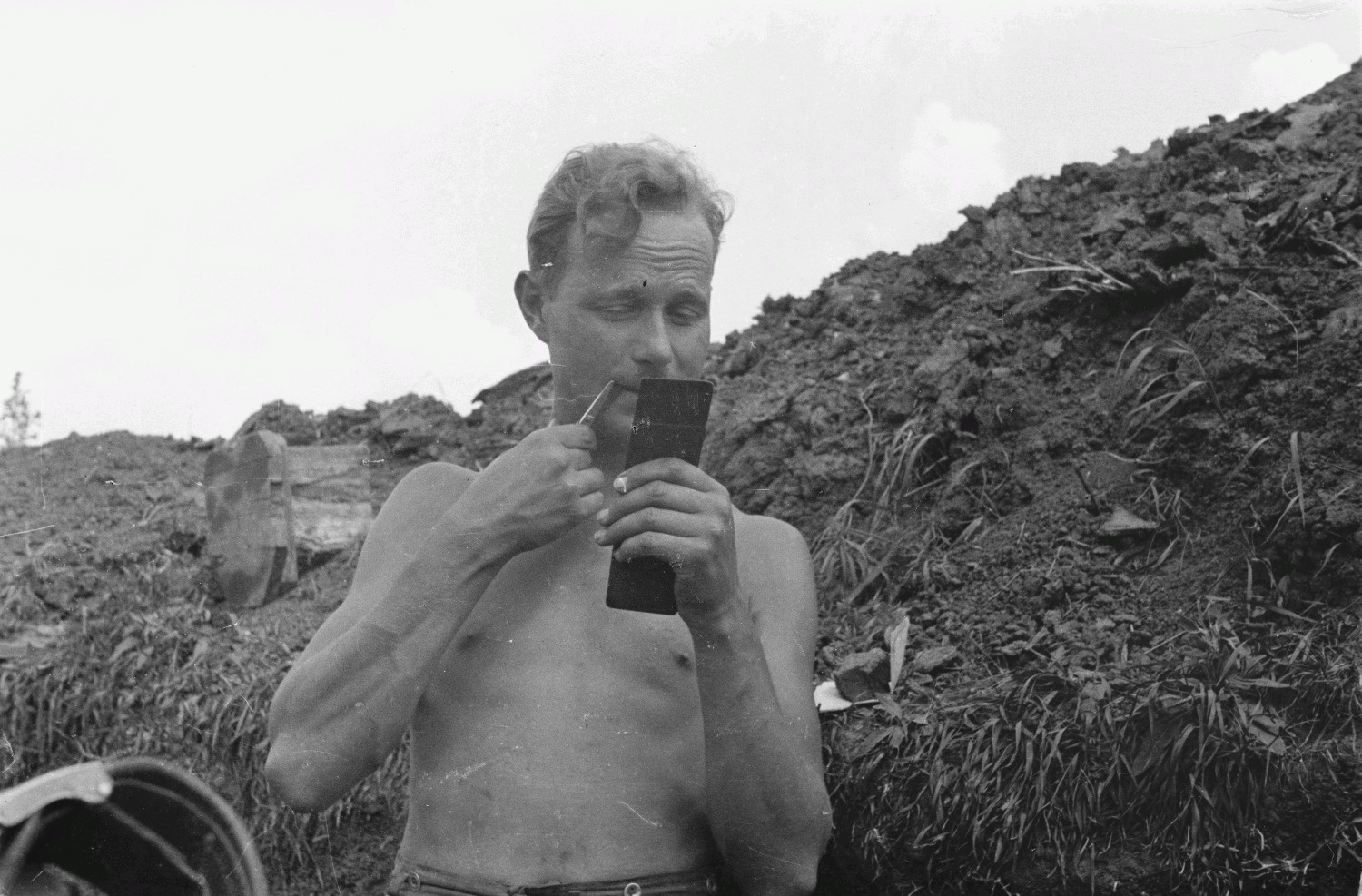 Рядовой вермахта Франц Грассер (Franz Grasser, 26.03.1911 — 13.11.1944) подстригает себе усы, стоя в окопе. Курская область (ныне один из районов Белгородской области). Предположительно, снимок сделан весной-летом 1943 года, до боев на Курской дуге.