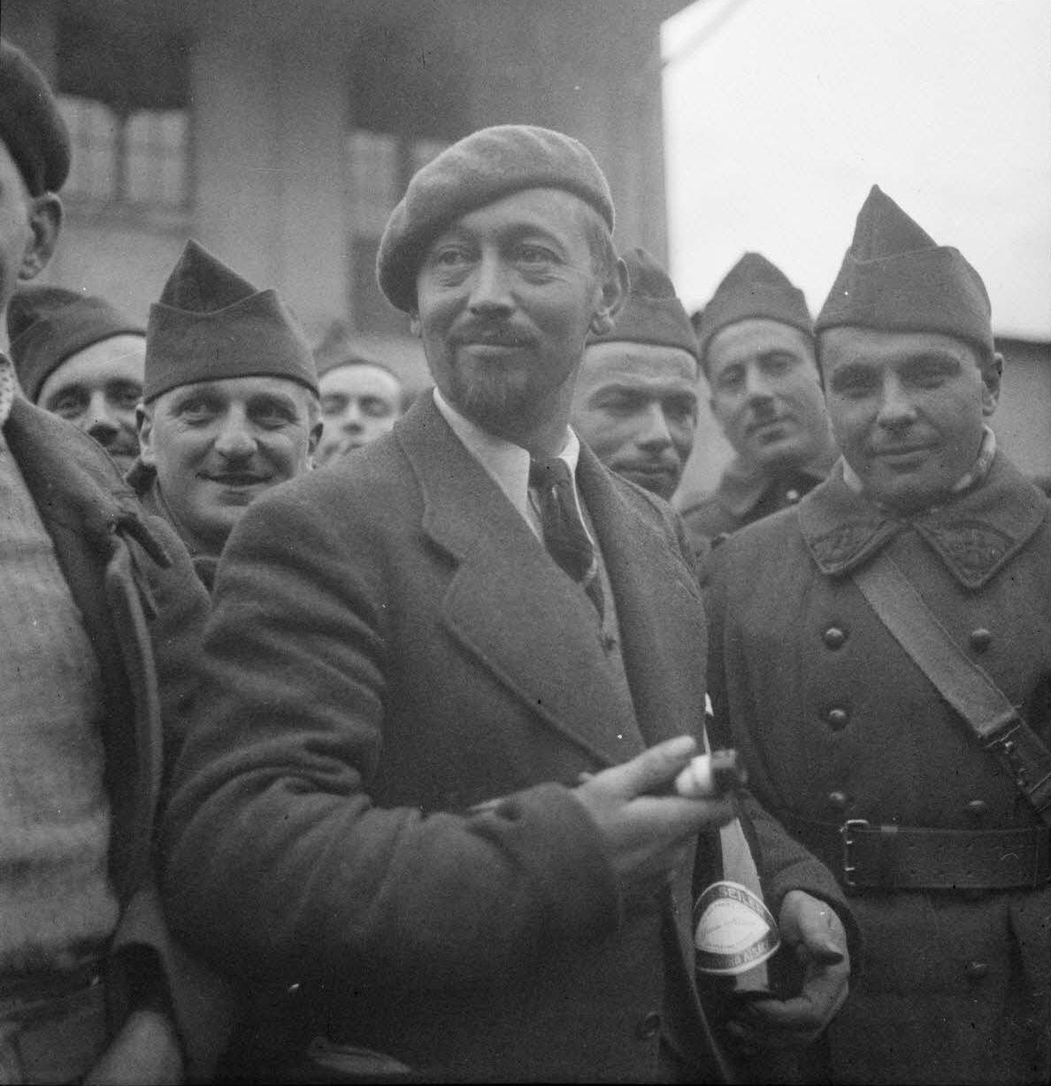 Ролан Доржелес (Roland Dorgelès), писатель-романист и военный корреспондент еженедельной газеты «Гренгуар» (Gringoire), с французскими солдатами запасного 71-го егерского пехотного батальона (71e bataillon de chasseurs à pied, 71e BCP) и местными жителями на празднике сбора винограда в деревне в Эльзасе.