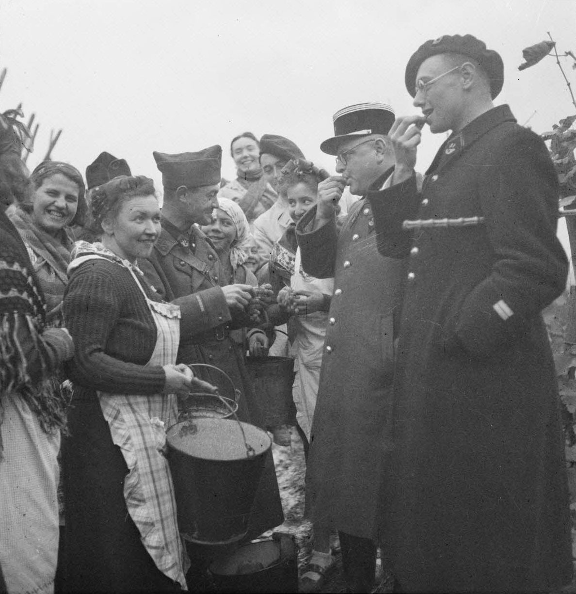 Французские офицеры, капитан из 2-го егерского пехотного батальона (2e bataillon de chasseurs à pied, 2e BCP) и лейтенант из 31-го егерского пехотного батальона (31e bataillon de chasseurs à pied, 31e BCP), из 14-й пехотной дивизии (14e division d’infanterie), и солдаты 42-го егерского пехотного батальона (42e bataillon de chasseurs à pied, 42e BCP) с местными жителями на празднике сбора винограда в деревне в Эльзасе.