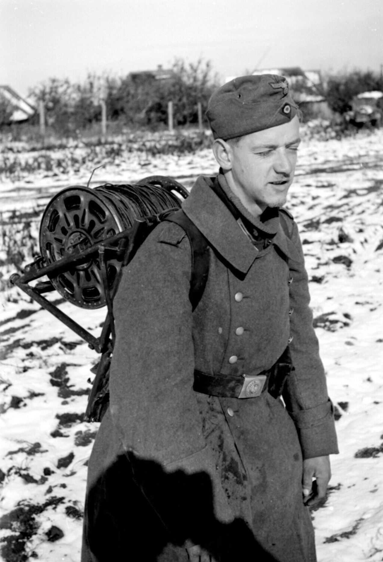 Связист II танковой группы «Гудериан» (Panzergruppe Guderian) сматывает полевую кабельную линию связи на окраине советского населенного пункта
