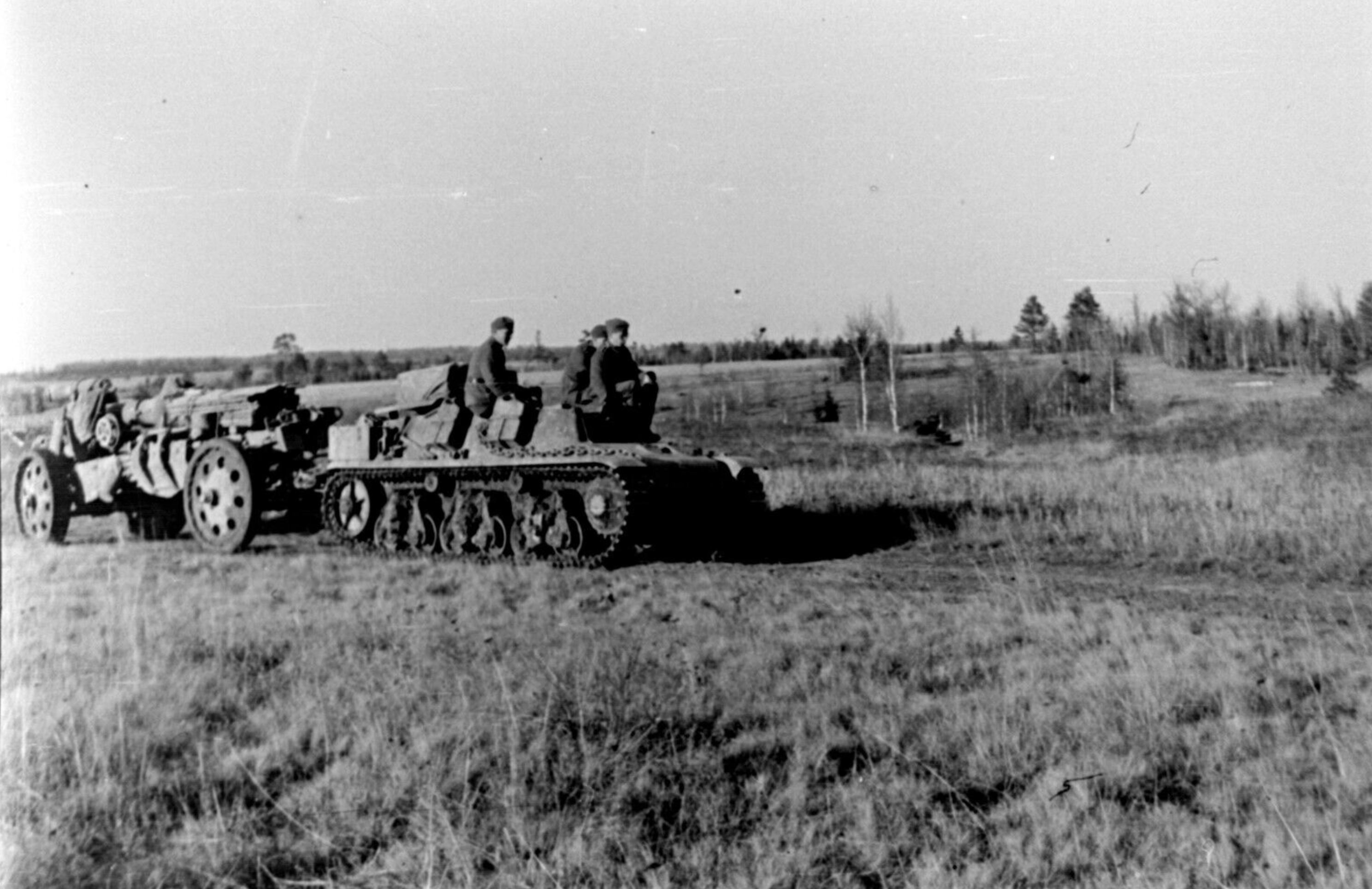 Артиллеристы 2-й танковой армии вермахта буксируют лафет тяжелой полевой гаубицы 15 cm s.F.H. 18 (150 cm schwere Feldhaubitze 18). В кадре трофейный танковый тягач на базе французского пехотного танка Hotchkiss H35.
