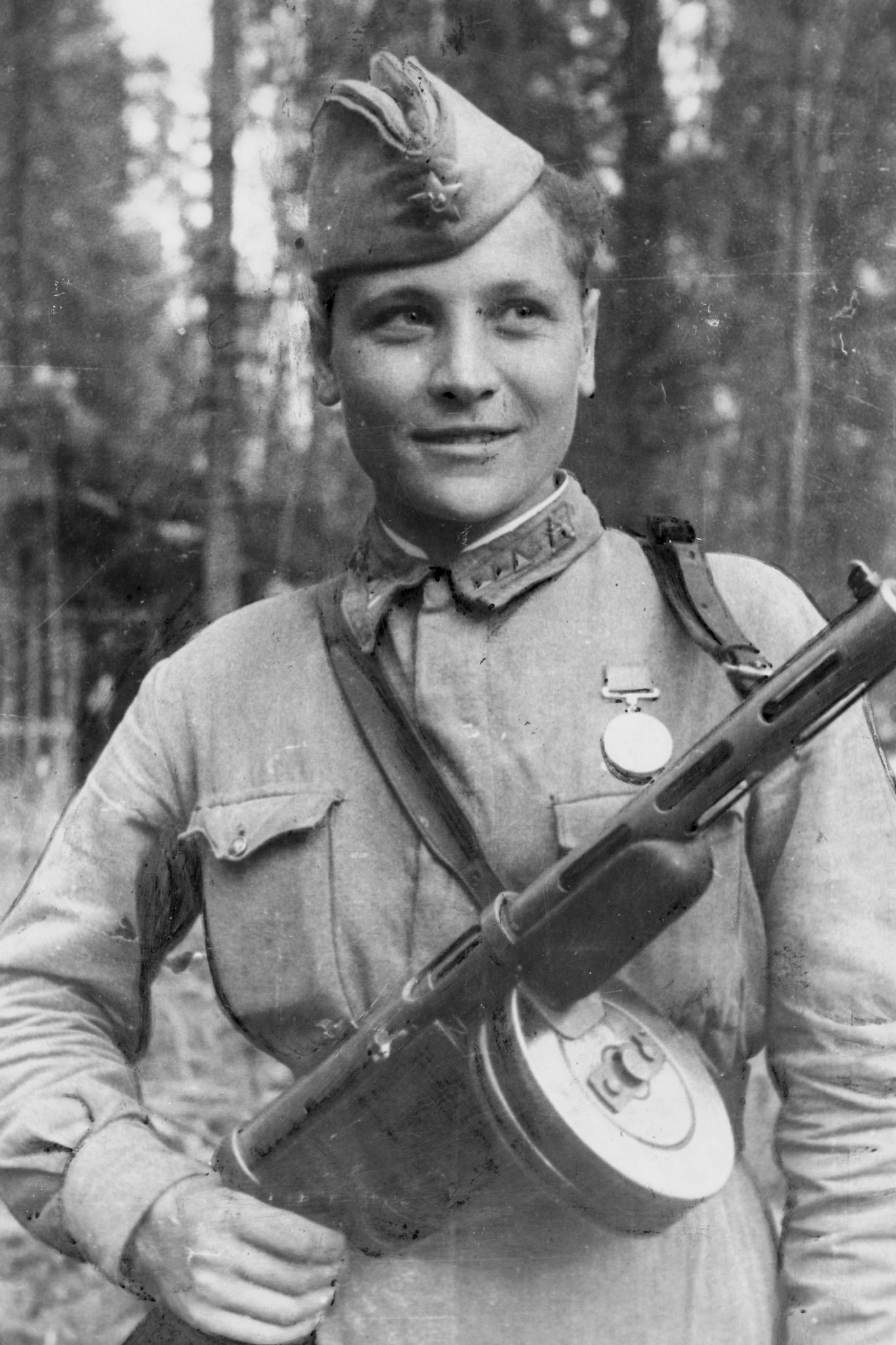 Разведчик 6-й отдельной гвардейской разведывательной роты 3-й гвардейской стрелковой дивизии 4-го гвардейского стрелкового корпуса 54-й армии Волховского фронта гвардии сержант Любовь Иосифовна Карцева (15.10.1922 — 21.11.1943), награжденная медалью «За отвагу», с пистолетом-пулеметом ППД.