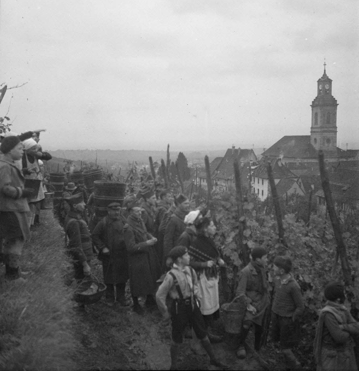 Французские солдаты 42-го егерского пехотного батальона 23-й егерской пехотной полубригады (42e bataillon de chasseurs à pied, 42e BCP; 23e demi-brigade de chasseurs à pied) помогают местным жителям собирать виноград в деревне Риквир (Riquewihr) в Эльзасе.