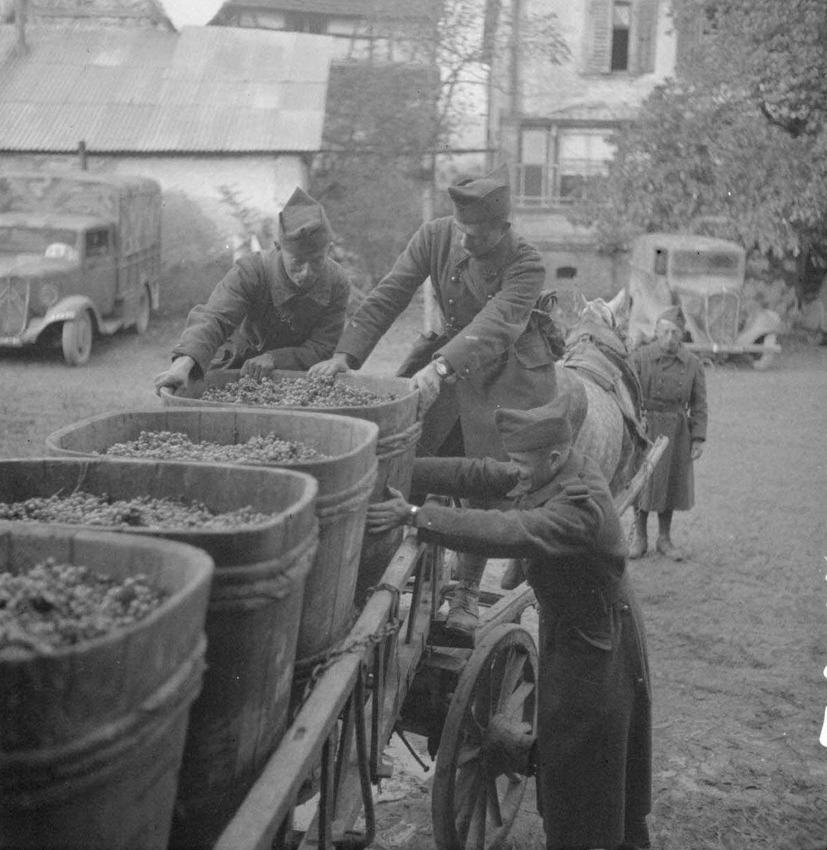Французские солдаты 42-го егерского пехотного батальона (42e bataillon de chasseurs à pied, 42e BCP) помогают местным жителям собирать виноград в деревне в Эльзасе.