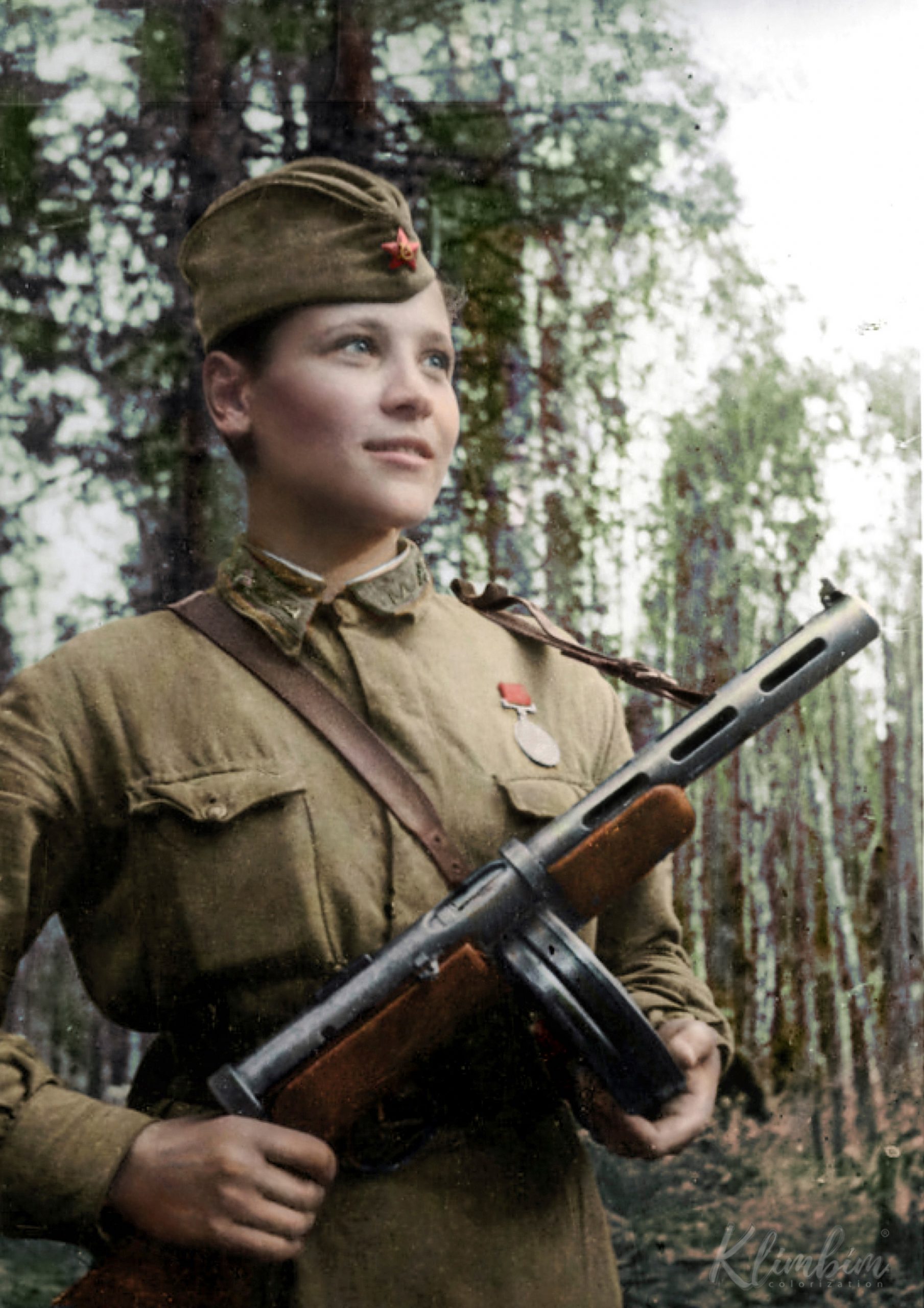 Разведчик 6-й отдельной гвардейской разведывательной роты 3-й гвардейской стрелковой дивизии 4-го гвардейского стрелкового корпуса 54-й армии Волховского фронта гвардии сержант Любовь Иосифовна Карцева (15.10.1922 — 21.11.1943), награжденная медалью «За отвагу», с пистолетом-пулеметом ППД.