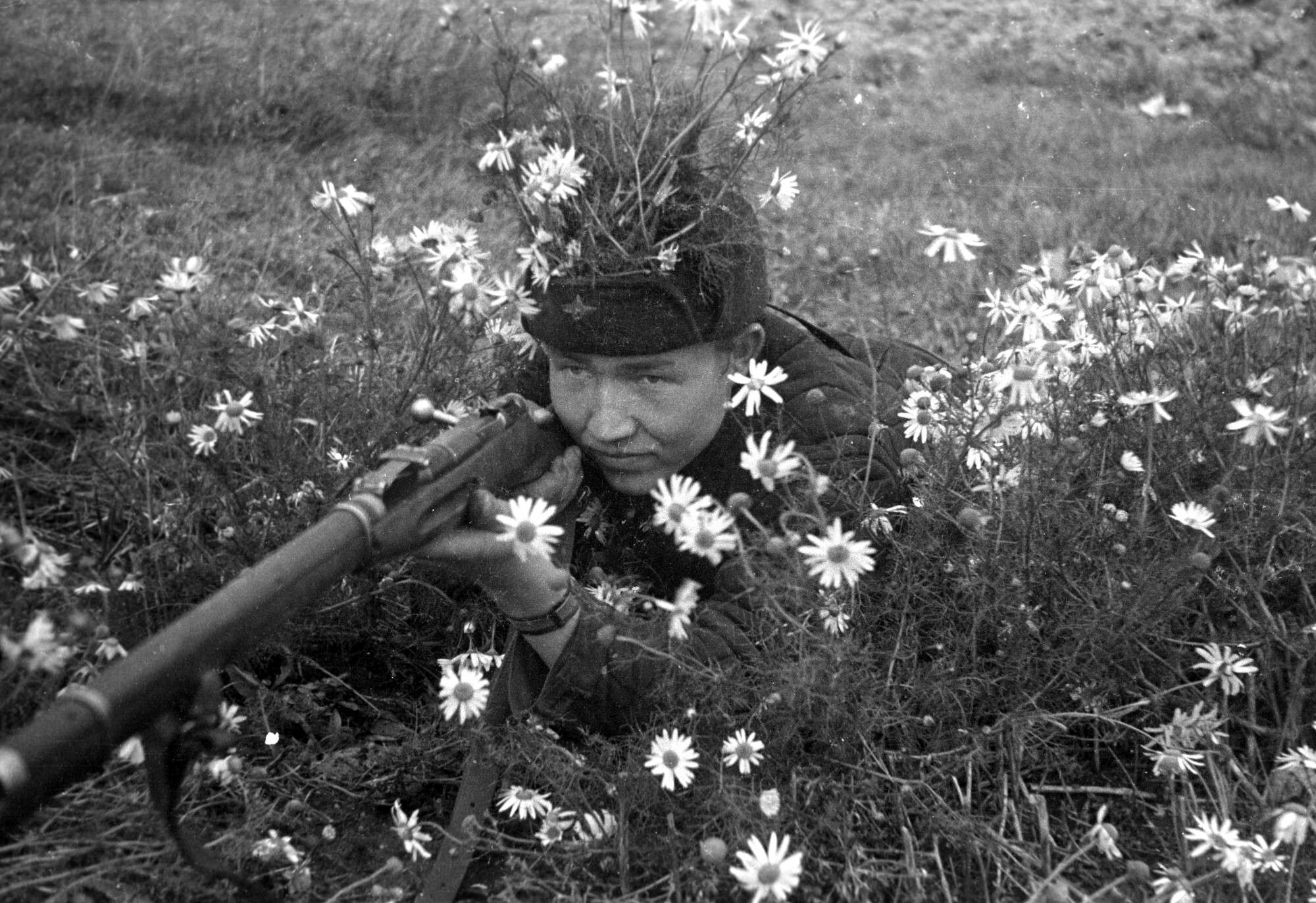 Красноармеец 125-й стрелковой дивизии Ленинградского фронта на позиции в поле с винтовкой Мосина.