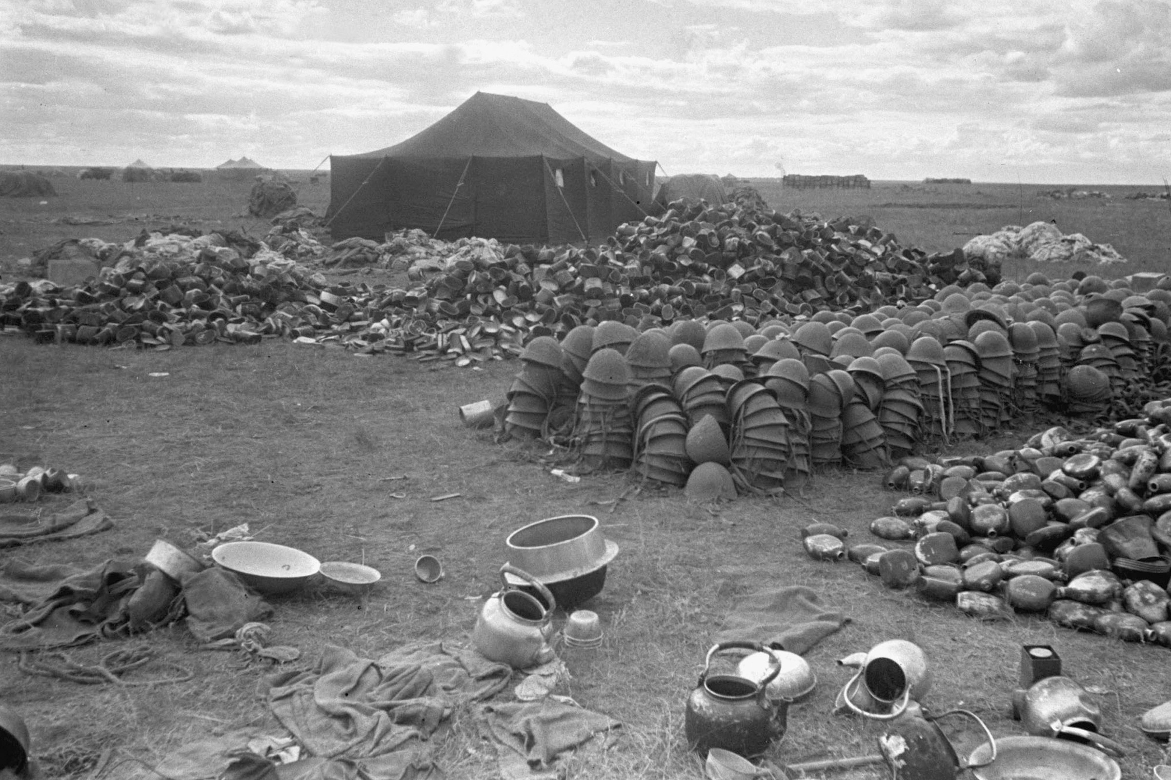 Японские каски, фляги, котелки и прочее имущество, собранное советскими трофейными командами после боев на реке Халхин-Гол. Ещё снимок с этого места.