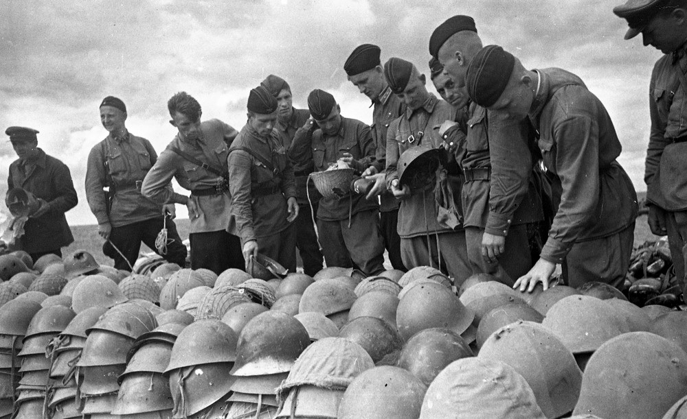 Японские каски, собранные советскими трофейными командами после боев на реке Халхин-Гол
