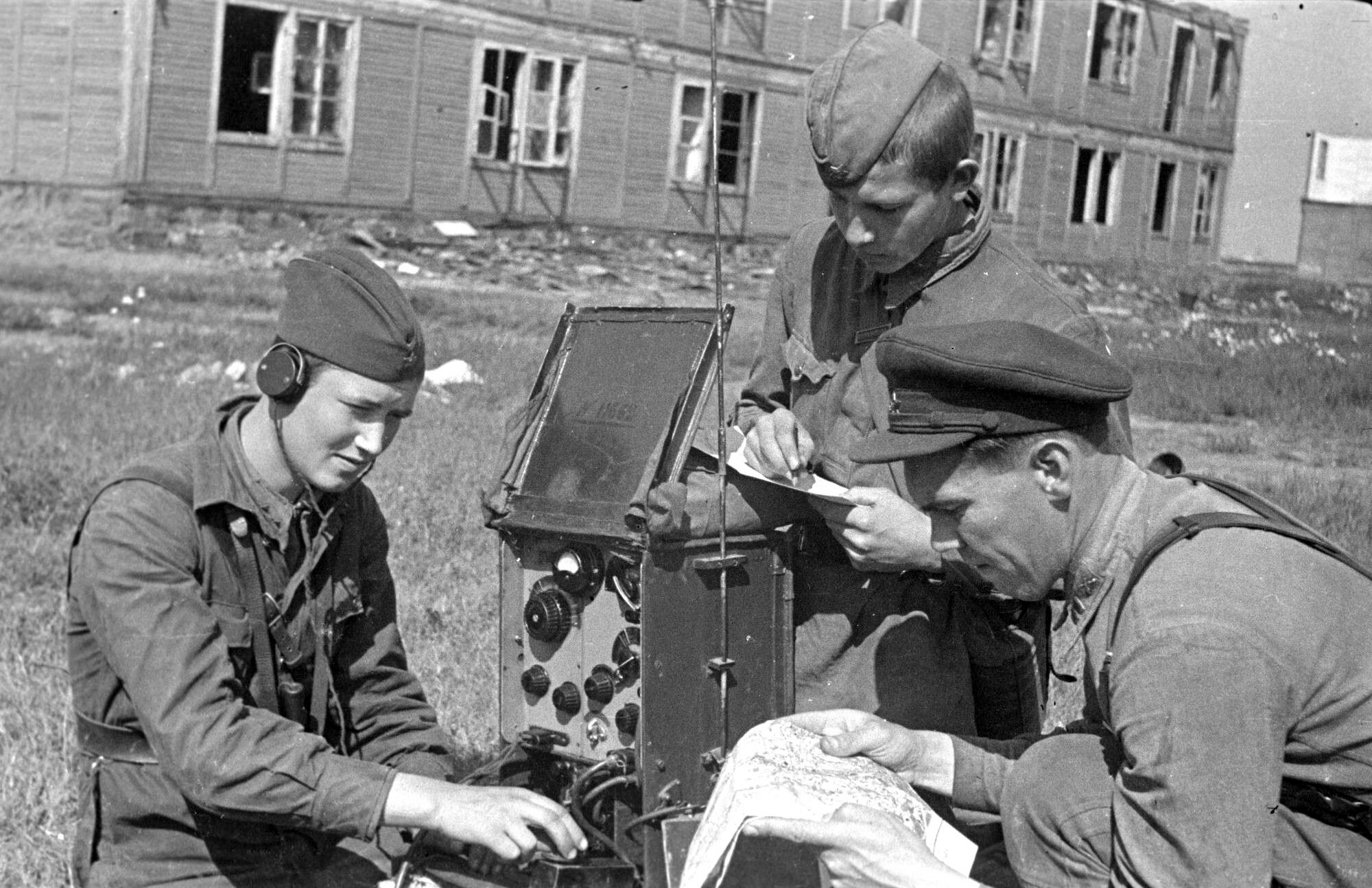 Офицер и связисты одного из подразделений 125-й стрелковой дивизии Ленинградского фронта у приемо-передающей телефонно-телеграфной симплексной переносной радиостанция ПК-6. Радиостанция предназначалась для работы в радиосети стрелковых, артиллерийских полков и батарей.