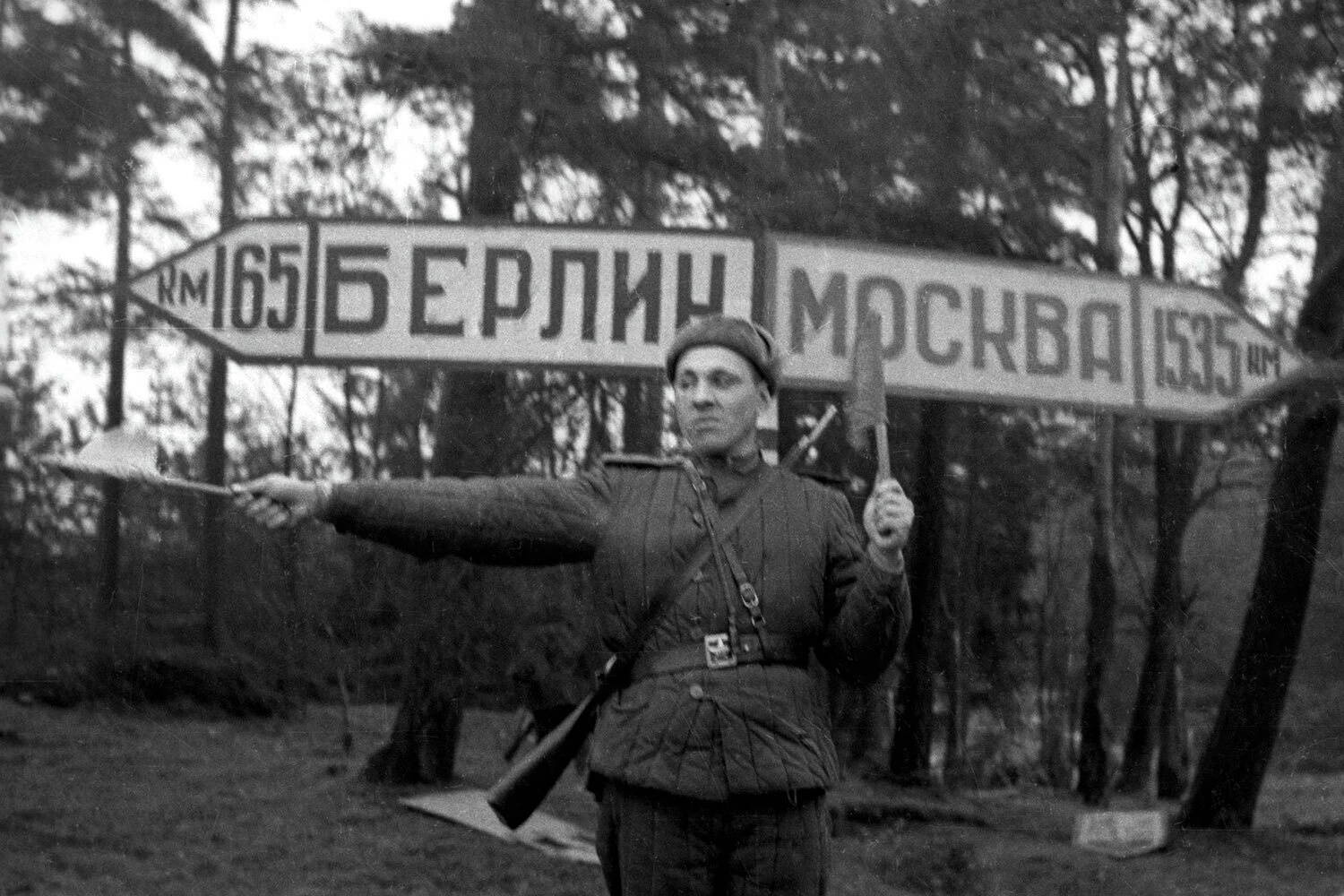 Советский регулировщик на дороге в 165 км от Берлина