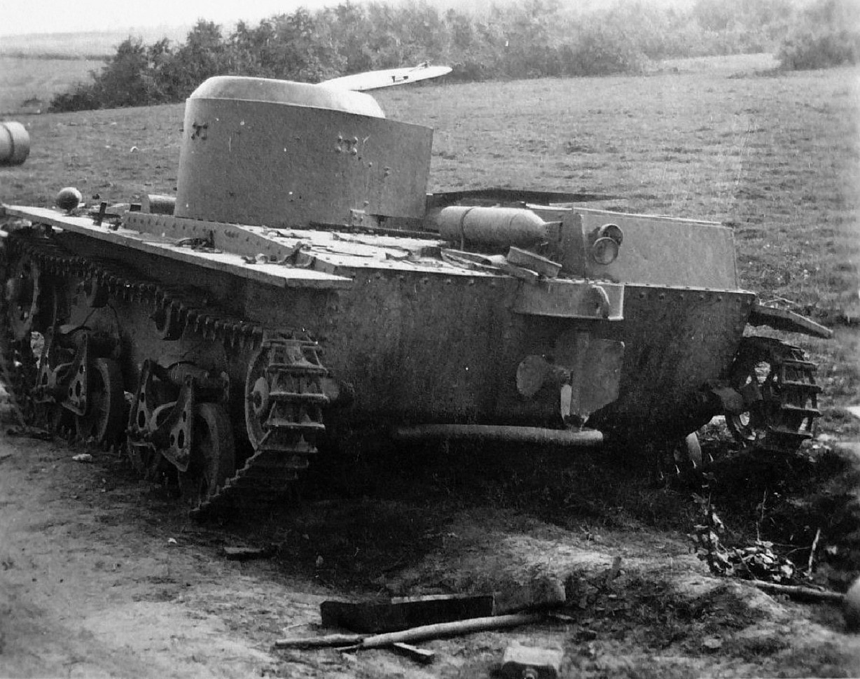 Брошенный на дороге советский легкий плавающий танк Т-38.