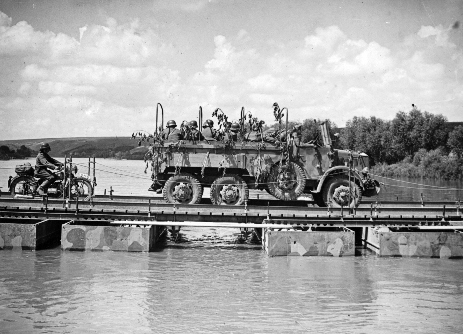 Венгерский армейский грузовик Раба «Ботонд» (Rába 38M Botond) переправляется через водную преграду по понтонному мосту на советско-германском фронте. Снимок из следующей серии. В кадре мотоциклист на мотоцикле BMW R 51.
