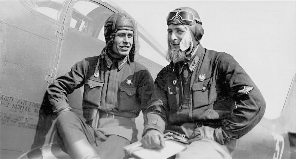 Летчики 16 гв. ИАП Андрей Труд и Вадим Фадеев на крыле истребителя P-39 «Аэрокобра»