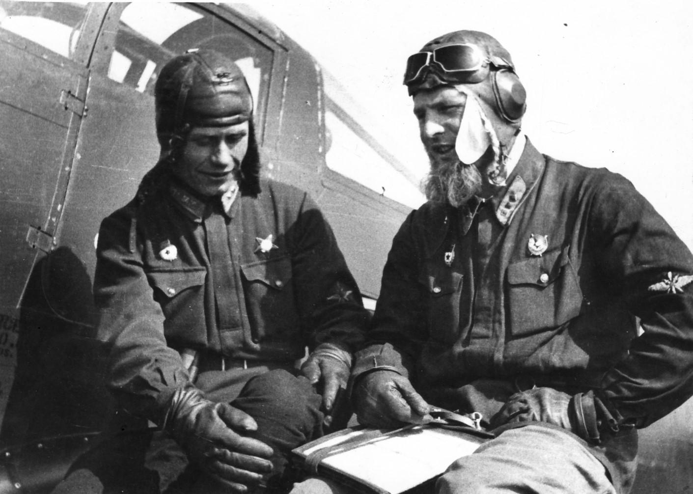 Летчики-истребители 16-го гвардейского истребительного авиационного полка 216-й смешанной авиационной дивизии 4-й Воздушной армии Северо-Кавказского фронта пилот гвардии лейтенант Андрей Иванович Труд (20.08.1921 — 27.07.1999) и командир эскадрильи гвардии старший лейтенант Вадим Иванович Фадеев «Борода» (25.12.1917 — 05.05.1943) на крыле истребителя P-39D-2 «Аэрокобра» Фадеева.