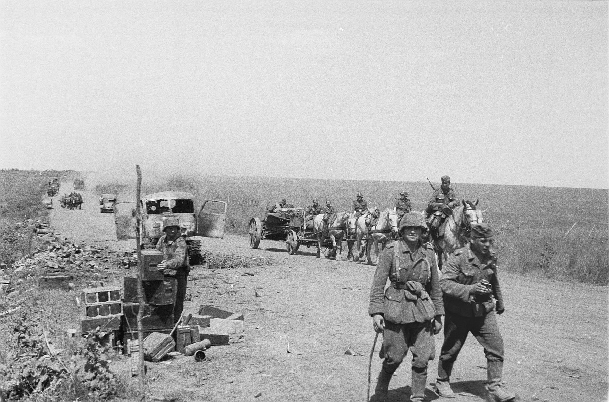 Конные повозки вермахта движутся мимо сгоревшего немецкого многоцелевого гусеничного тягача RSO (Raupenschlepper Ost) в Курской области. Справа шестерка лошадей транспортрует тяжелую полевую пушку. Слева лежат деревянные ящики с зарядами к немецкой 105-мм полевой пушке.