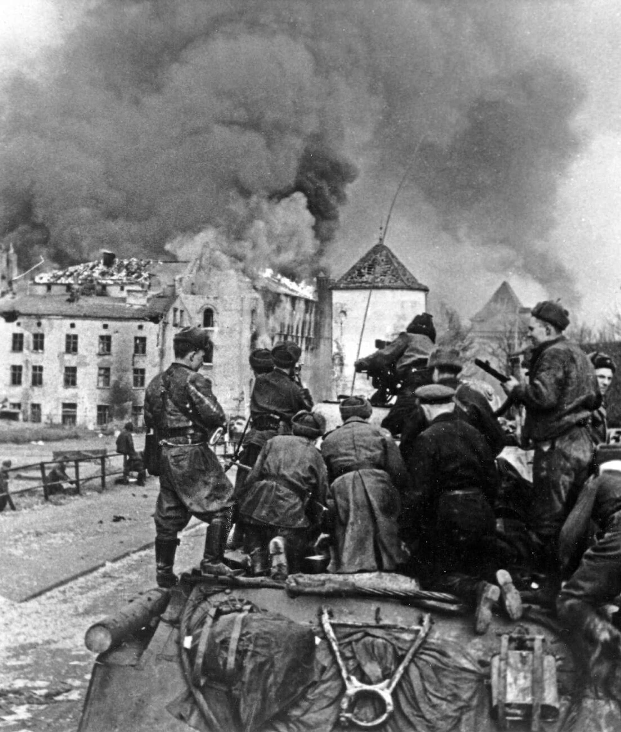 Советские солдаты на танке ИС-2 во время боев за Данциг (ныне Гданьск (Gdańsk) в составе Польши). Впереди видна Белая башня (Biała Baszta). Они движутся по улице Штадграбен (Stadtgraben, ныне улица Nowe Podwale Grodzkie).