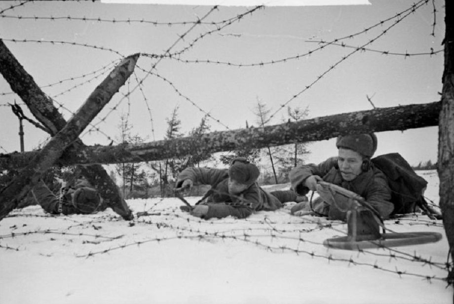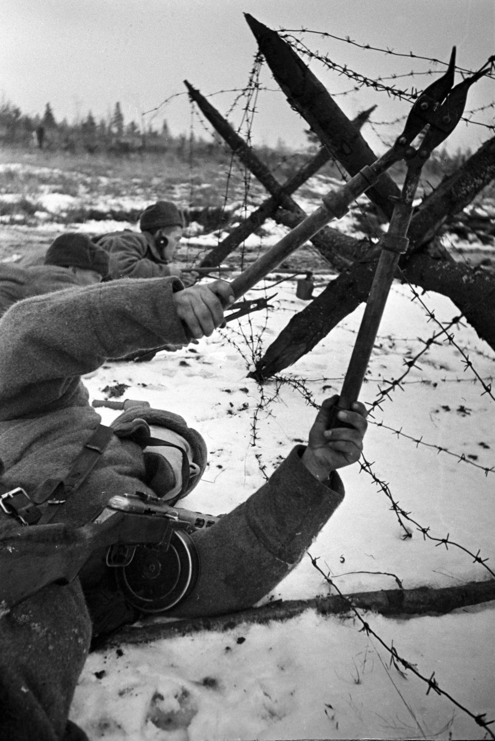 Красноармейцы 73-го стрелкового полка 33-й стрелковой дивизии 3-й Ударной армии Калининского фронта сапер саперного взвода Василий Егорович Драчёв (1912 — 03.04.1943), разведчик взвода пешей разведки Павел Михайлович Кайгородов (1910 — 05.03.1943) и сапер-разведчик взвода пешей разведки Иван Михайлович Аксёнов (1923 — 28.07.1943) готовят проходы в немецких заграждениях. Зима 1942-1943 гг.