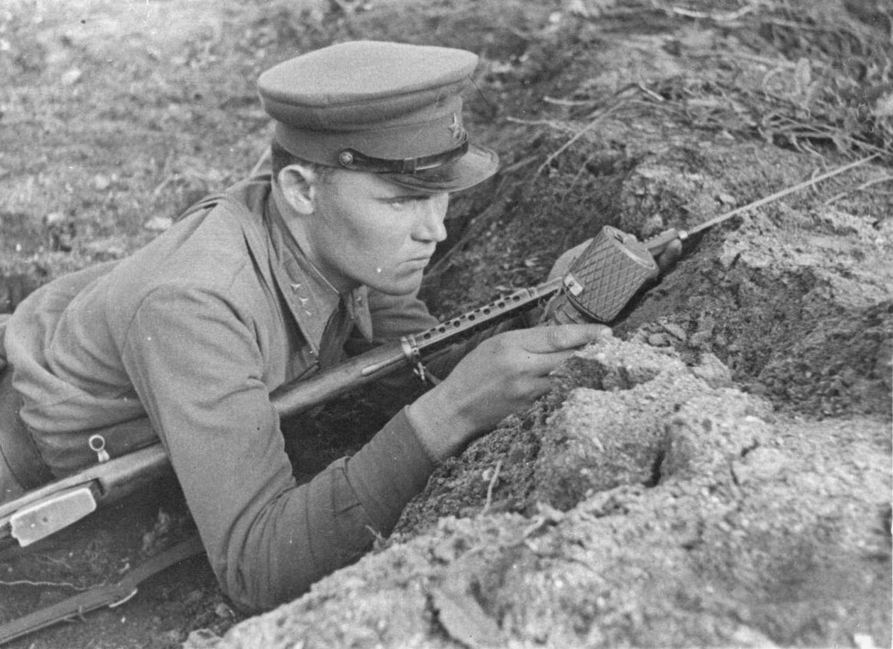 Советский пограничник старший сержант Макаренко, вооруженный 7,62-мм самозарядной винтовкой системы Токарева образца 1940 года (СВТ-40) и ручной осколочной гранатой РГД-33, на огневой позиции в период первых боев на границе.