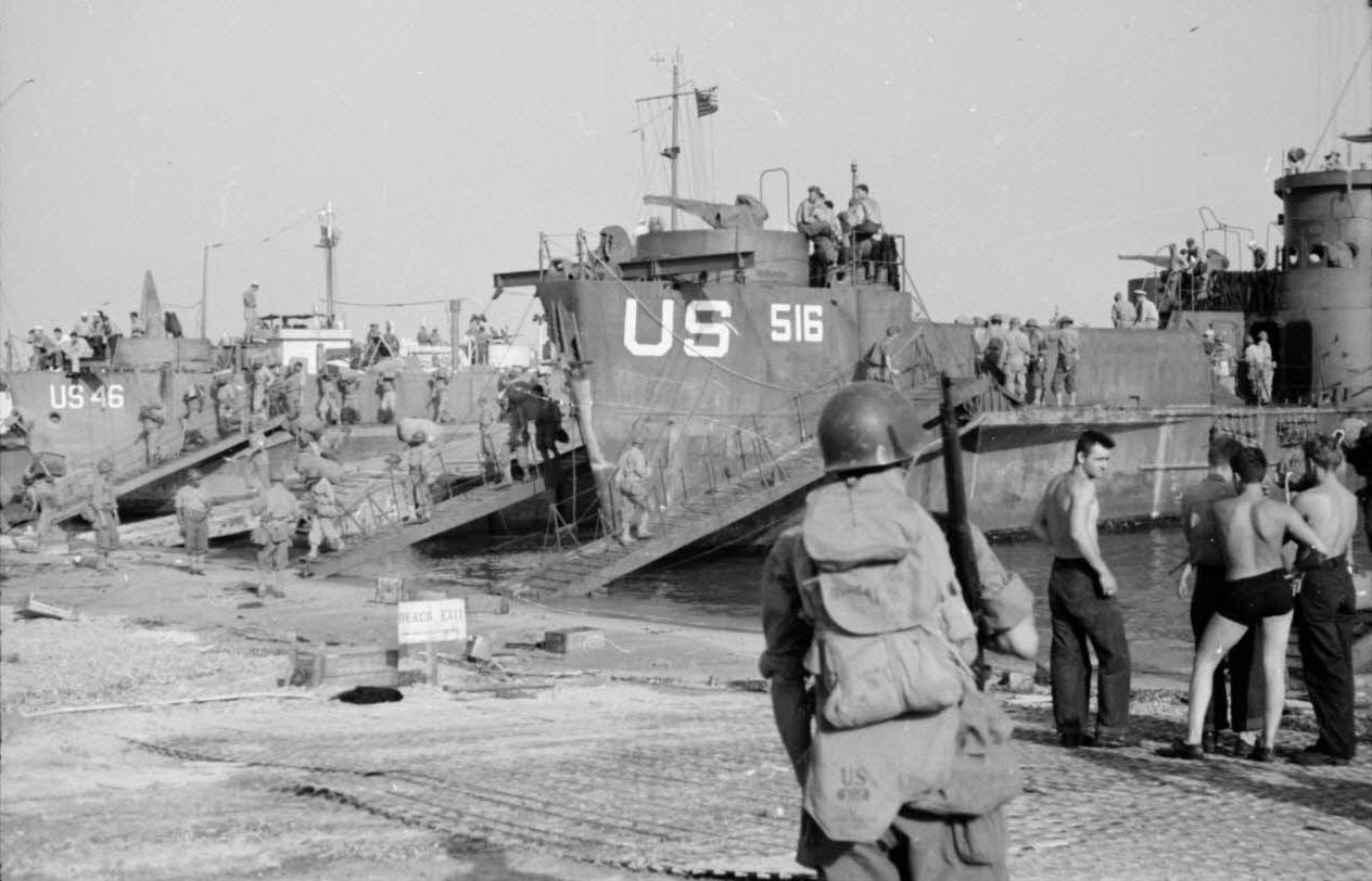 Французские солдаты сходят на берег с американских десантных судов в районе Сен-Тропе