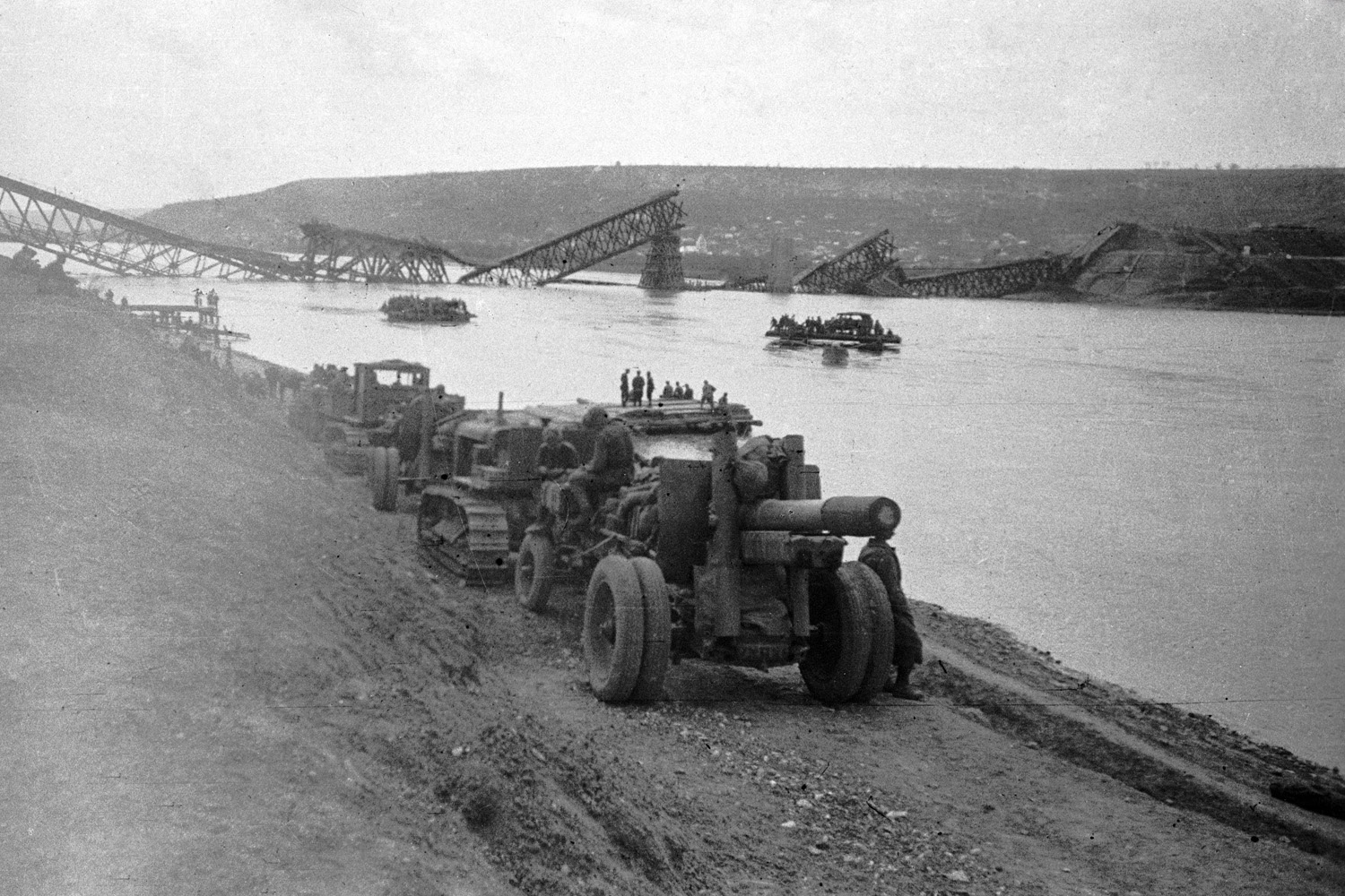 Советские 152-мм гаубицы МЛ-20 у подорванного моста через Днестр в районе Рыбницы.
