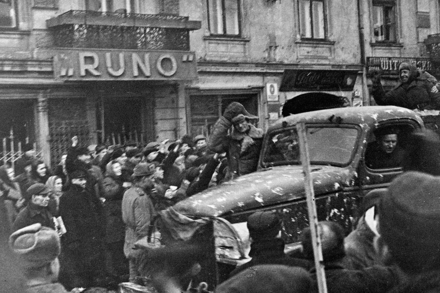 Жители города Ченстохова (Częstochowa) встречают своих освободителей — советских солдат, едущих на грузовике GMC CCKW-352.