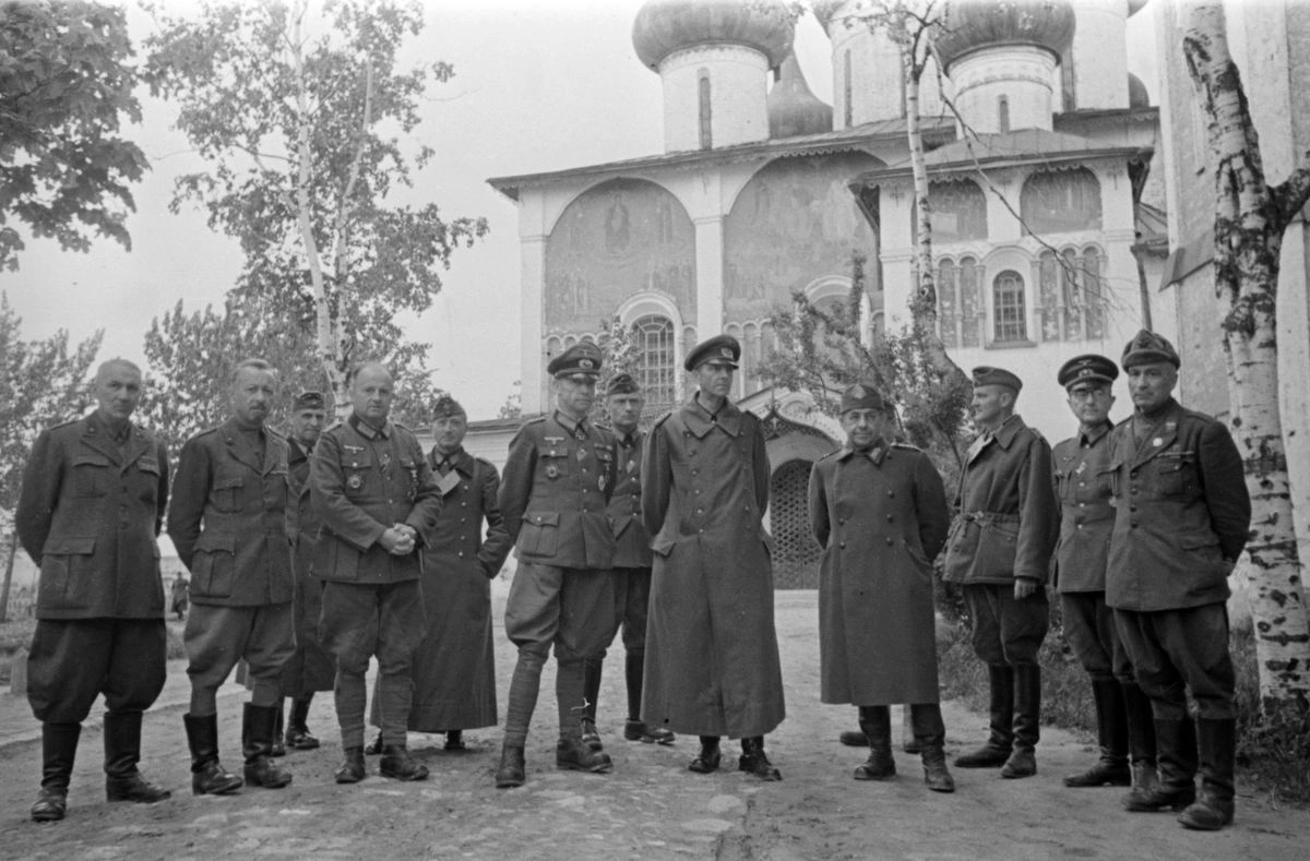 Пленный немецкий генерал-фельдмаршал Фридрих Паулюс (Friedrich Wilhelm Ernst Paulus, 1890—1957, на снимке 5-й справа) среди немецких и итальянских офицеров в «генеральском» лагере № 160 в Спасо-Евфимиевом монастыре в Суздале. Они стоят на фоне Преображенского собора.