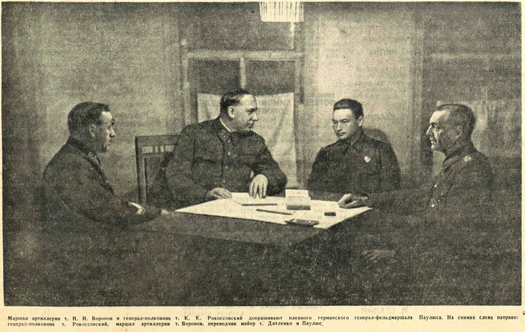 Пленный генерал-фельдмаршал, командующий капитулировавшей под Сталинградом немецкой 6-й армии Фридрих Паулюс на допросе в штабе. Слева направо: член военного совета Донского фронта генерал-майор Константин Фёдорович Телегин (1899 — 1981), командующий Донским фронтом генерал-полковник Константин Константинович Рокоссовский (1896–1968), представитель Ставки Верховного Главнокомандования маршал артиллерии Николай Николаевич Воронов (1899–1968), переводчик майор Николай Дмитриевич Дятленко (1914 — 1996), генерал-фельдмаршал Фридрих Паулюс (Friedrich Paulus, 1890-1957). На хуторе Заварыгин размещался штаб Донского фронта.