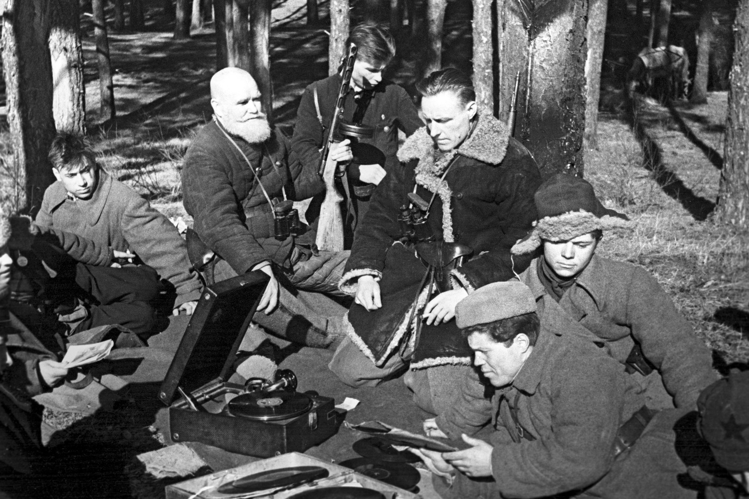 Бойцы Сумского партизанского соединения под командованием С.А. Ковпака слушают музыку на привале. В центре снимка с бородой и ППШ в руке — комиссар артиллерии Сумского партизанского соединения Алексей Ильич Коренев (1887 г.р.) .