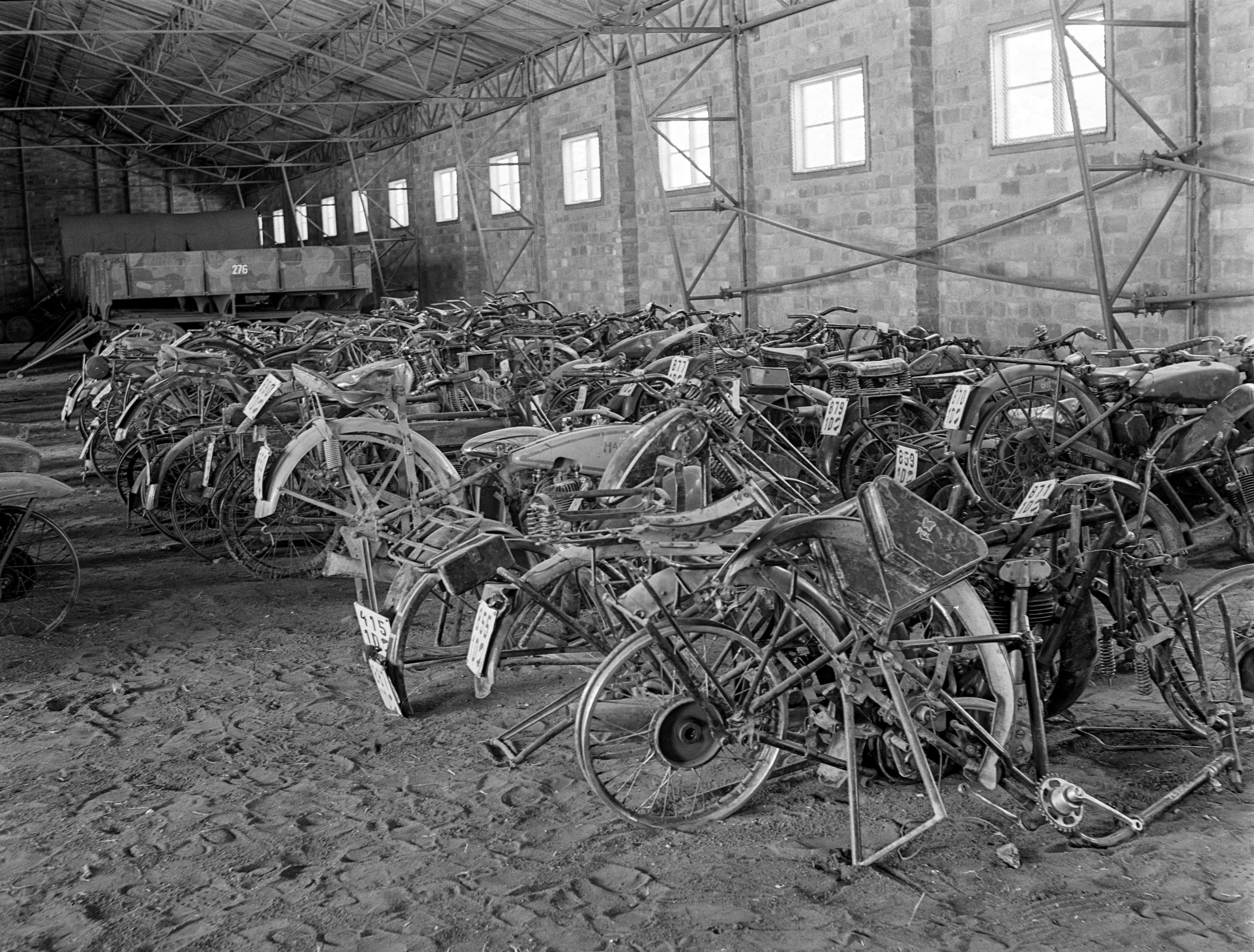 Разукомплектованные венгерские армейские мотоциклы на складе в автопарке на улице Уйсас, 41-43 (Újszász utca) в городке Матяшфёльд (Mátyásföld) под Будапештом (ныне квартал Матяшфёльд в 16-м округе Будапешта).