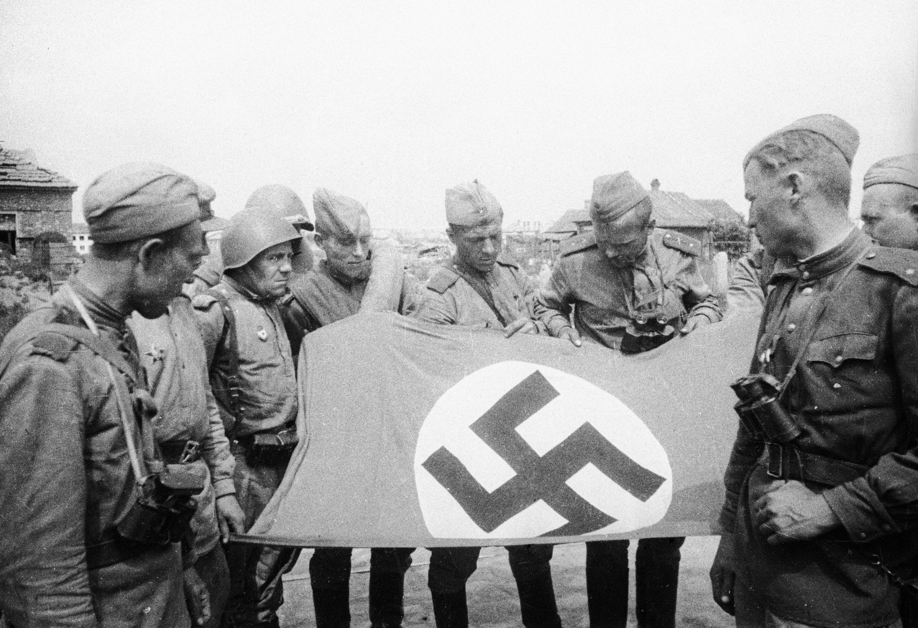 Бойцы и командиры РККА осматривают государственный флаг нацистской Германии, захваченный в Витебской области Белоруссии.