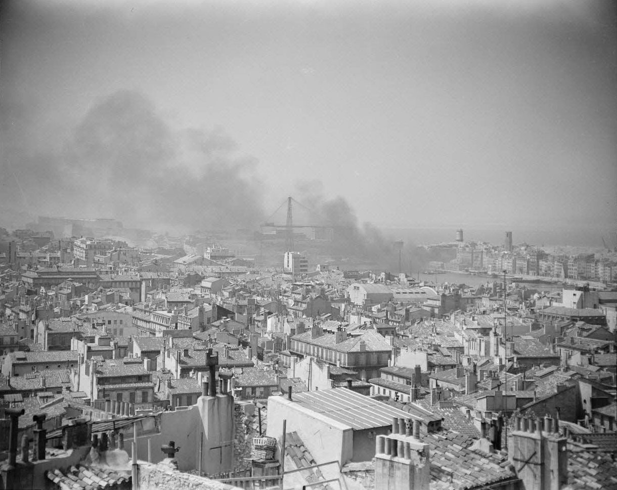 Вид на квартал Старый Порт в Марселе (Marseille) во время боев за освобождение города. Виден дым от артиллерийских обстрелов.