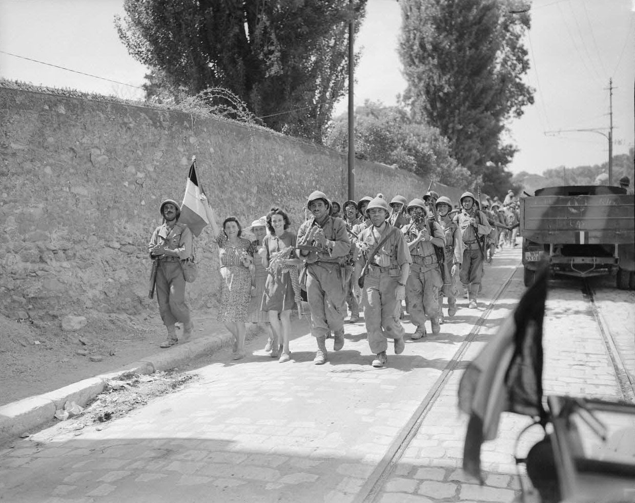 Колонна французских солдат 3-й алжирской пехотной дивизии (3e division d’infanterie algérienne, 3e DIA) проходит по кварталу Сент-Март в Марселе (Marseille) в направлении Гардана (Gardanne) после освобождения города.