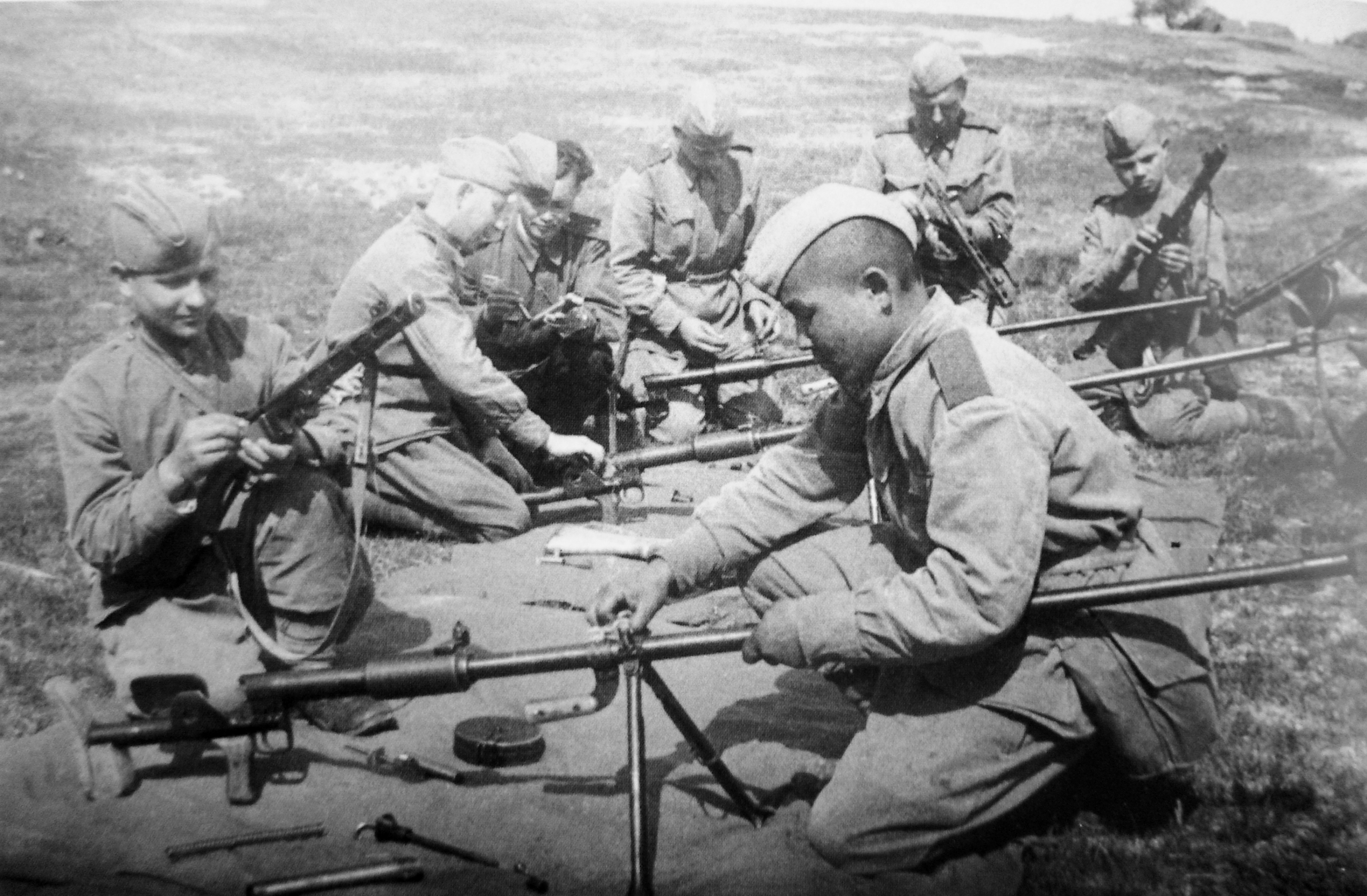 Проверка оружия (противотанковых ружей ПТРД-41 и пистолетов-пулеметов ППШ) перед боем в роте гвардии старшего лейтенанта Аркена Курмашева (третий слева). 2-я гвардейская механизированная бригада 1-го гвардейского механизированного корпуса Юго-Западного фронта.