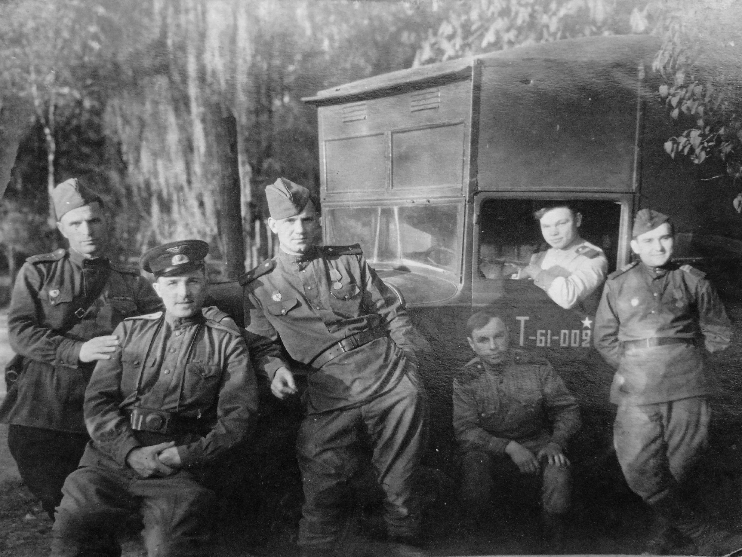 Военнослужащие 1-й отдельной роты аэрофотослужбы 16-й Воздушной Армии у автобуса на базе грузовика ГАЗ-ААА. На подножке автобуса сидит старший лаборант старшина Григорий Борисович Ицкович (г.р. 1915).