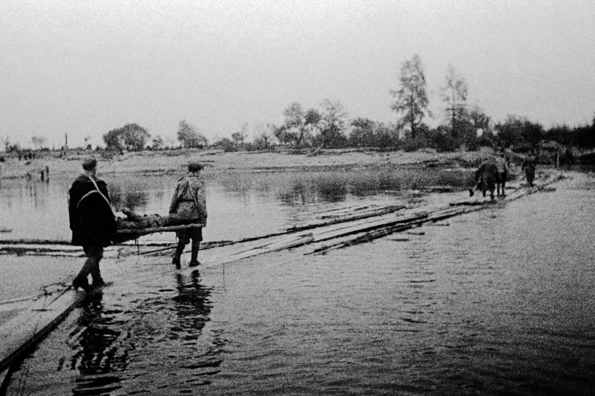 Партизаны Гомельской области переправляют раненых товарищей через реку Днепр.
