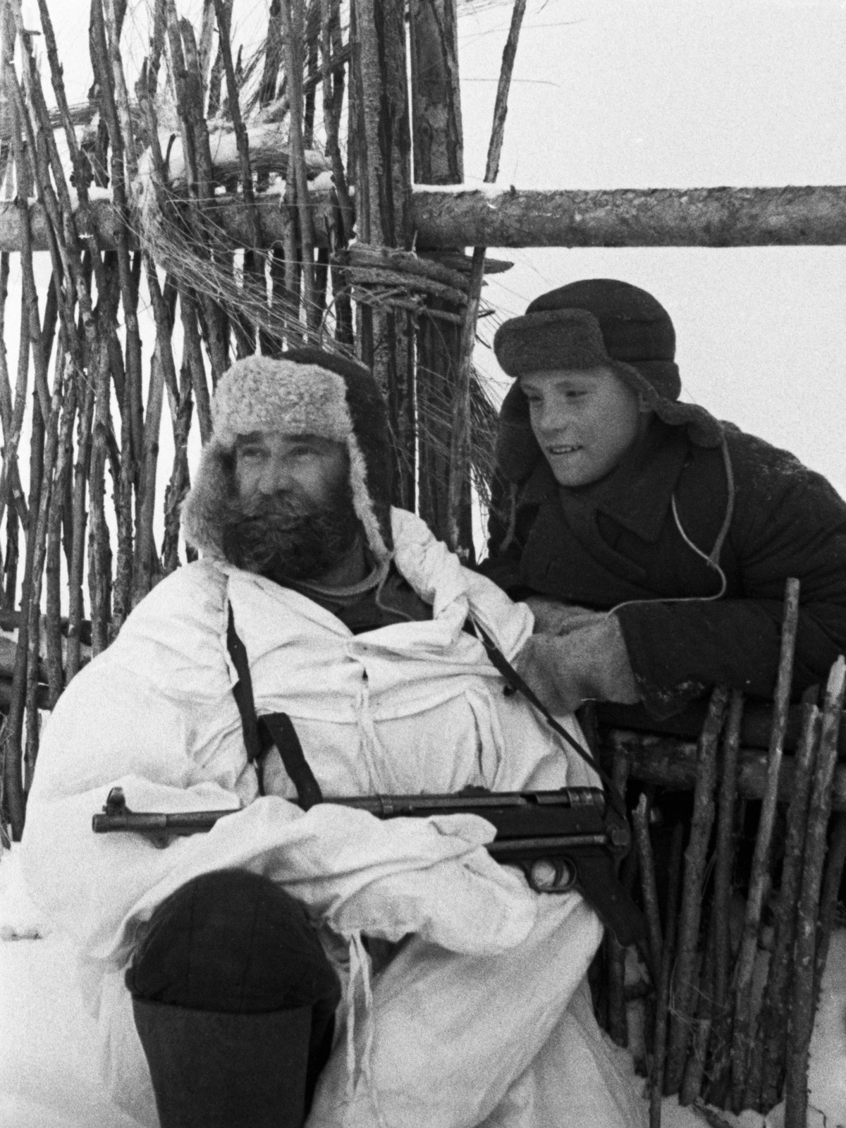 Партизаны Ленинградской области ведут наблюдение за деревней, занятой противником. Партизан в зимнем маскхалате вооружен немецким пистолетом-пулеметом MP.40. Северо-Западный фронт.