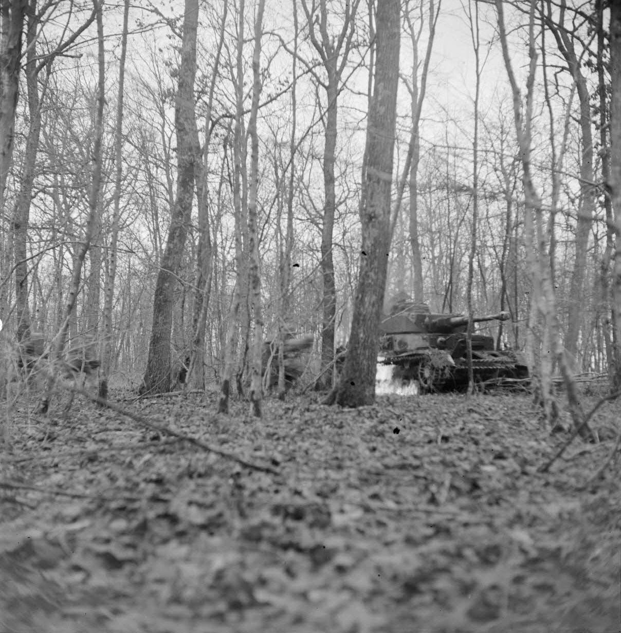 Немецкий средний танк Panzerkampfwagen IV из 106-й танковой бригады «Фельдхернхалле» (Panzerbrigade 106 Feldherrnhalle), подбитый 3 декабря во время атаки в лесу Ля-Ардт (La Hardt). В кадре видны смазанные фигуры пробегающих мимо французских солдат.