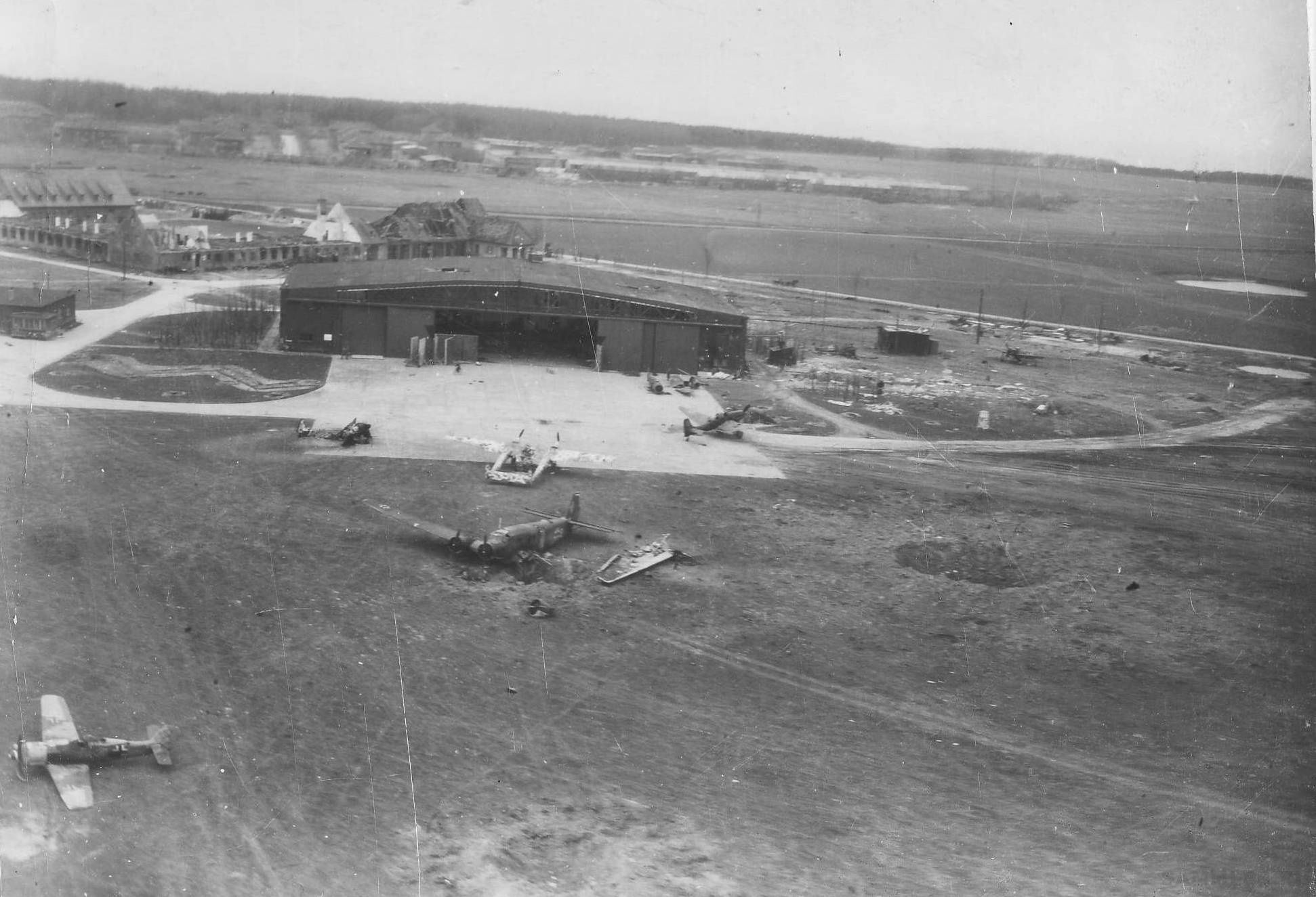 Вид на ангары и немецкие самолеты, поврежденные при налете на аэродром Гросс Диршкайм [2]