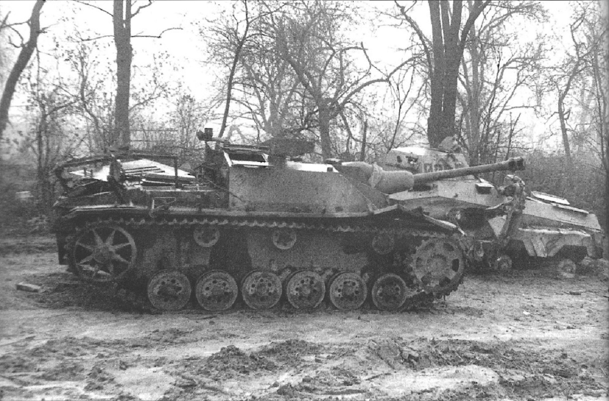 Немецкая САУ StuG III Ausf.G, брошенная на окраине Берлина. На втором плане разбитый немецкий тяжелый бронеавтомобиль Sd.Kfz. 231 (232) (8-Rad) (Schwerer Panzerspähwagen 8-Rad).