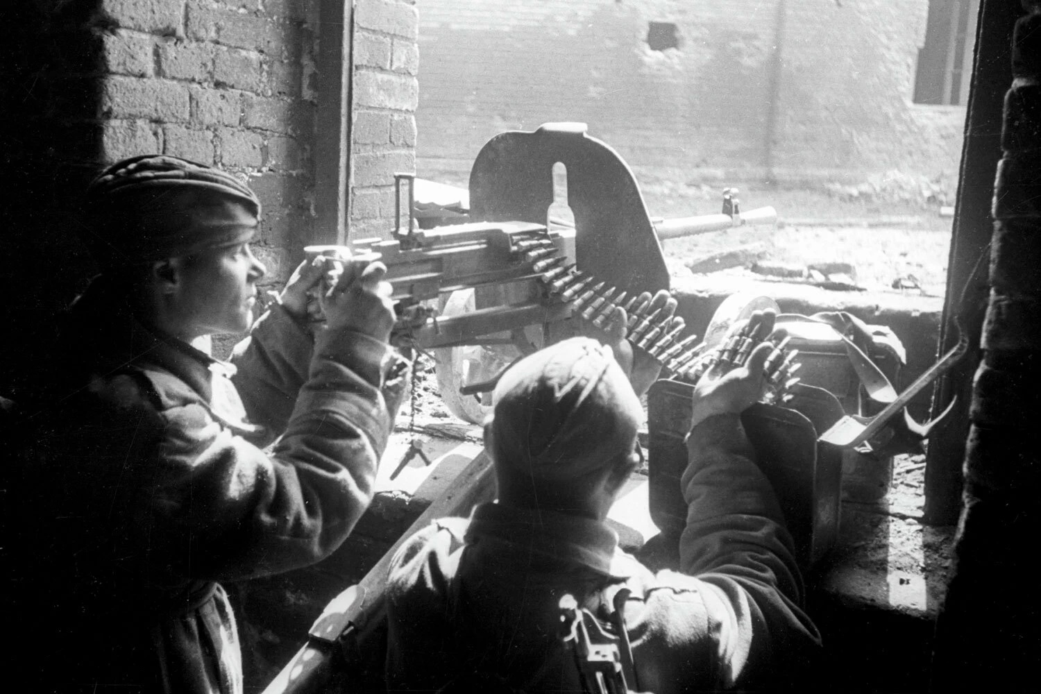 Бойцы советского пулеметного расчета станкового пулемета Горюнова (СГ-43) М. Третьяков и П. Кармаков ведут огонь из оконного проема в Берлине.
