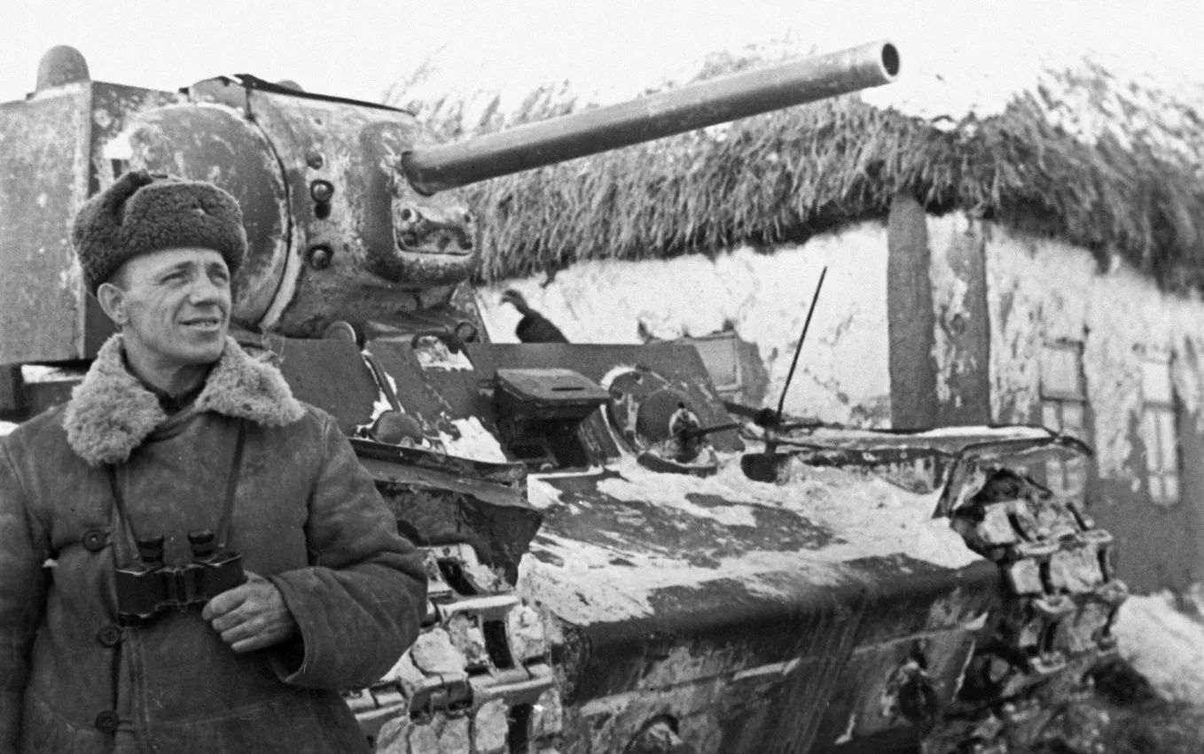 Командир 180-й танковой бригады полковник Михаил Захарович Киселев (21.11.1900 — 30.01.1991) у танка КВ-1 в освобожденном селе Касторное.