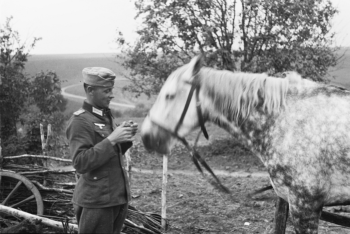 Обер-лейтенант 167-й пехотной дивизии вермахта угощает лошадь хлебом. Обер-лейтенант есть и на другом снимке.