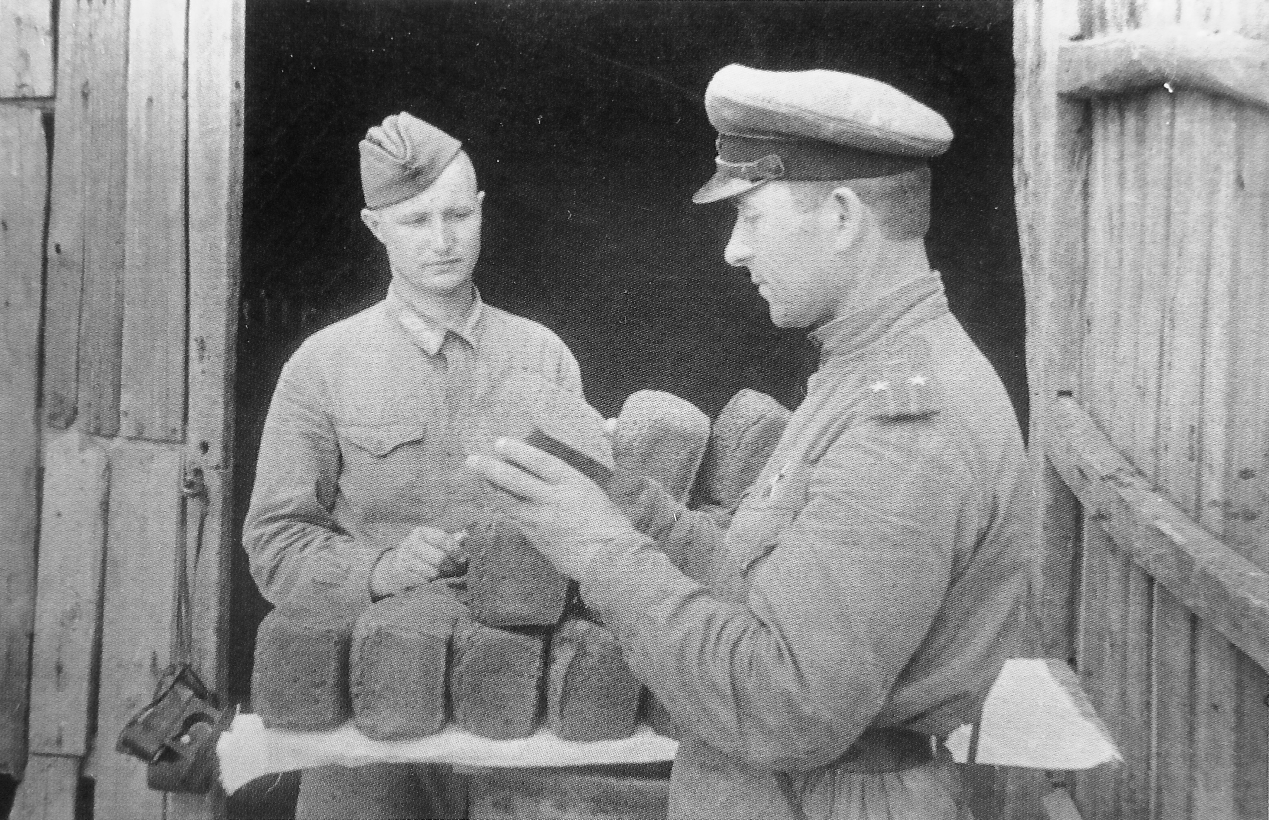 Гв. подполковник Лещенко и писарь хозчасти Голубев перед выдачей проверяют качество хлеба