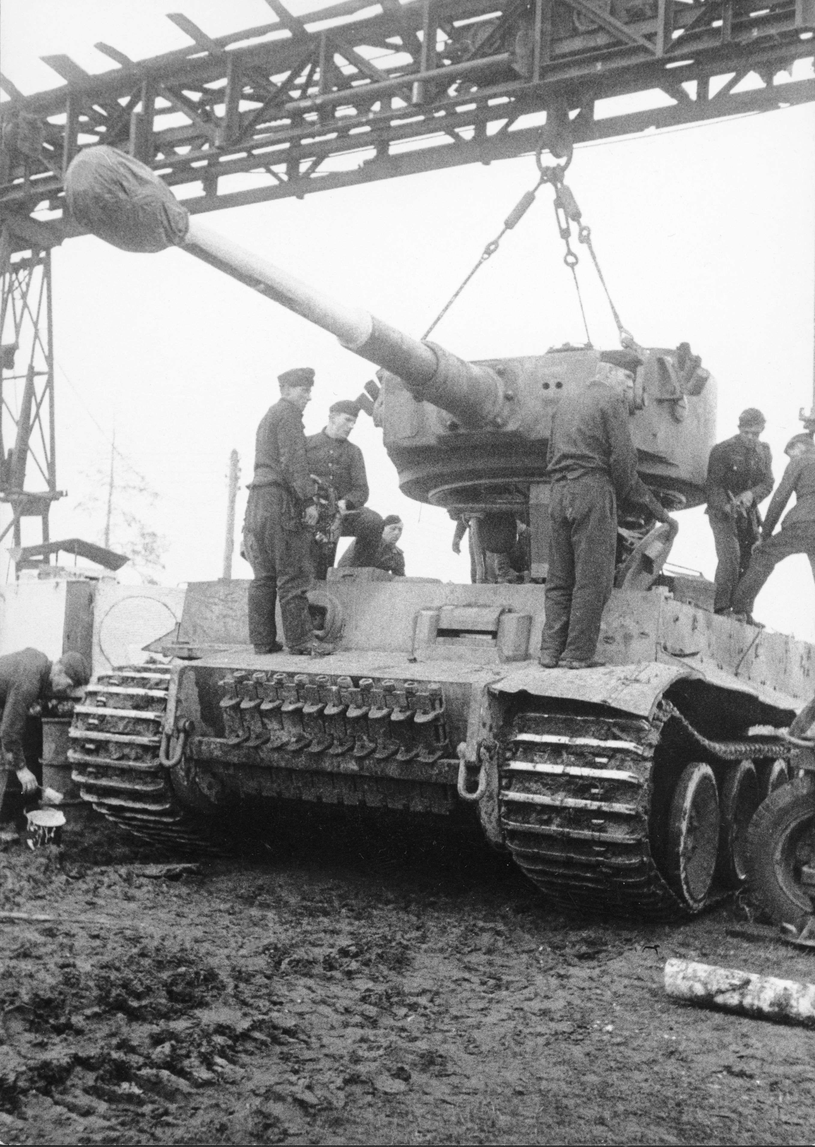 Немецкие танкисты демонтируют башню танка «Тигр» Pz.Kpfw. VI Ausf. H. в расположении ремонтной базы. В кадре 7,8-тонный кран производства компании «Фриз и сыновья», располагавшейся во Франкфурте. Кран также известен под названием кран «Штрабо» (Strabo — сокращение от «Strassenbock-Кгаn» или «подвижной кран»). Советско-германский фронт.