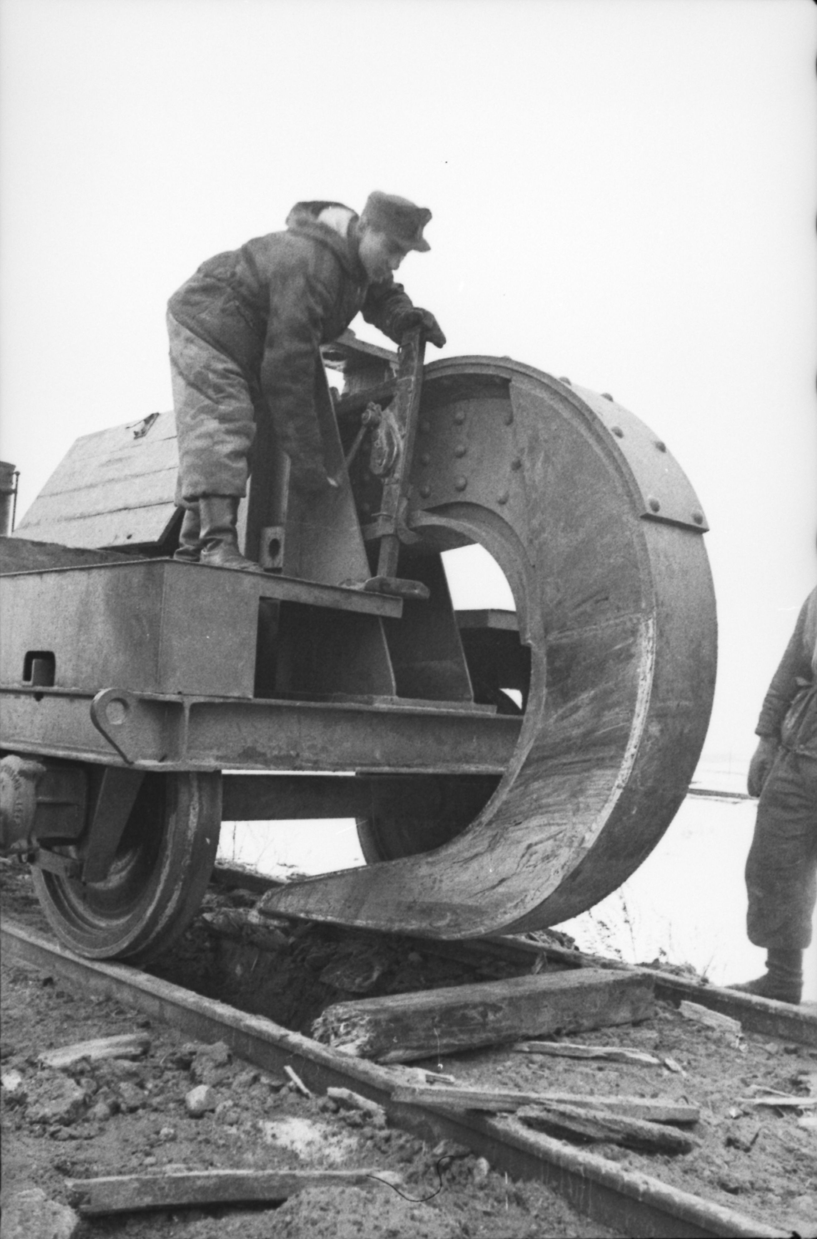 Немцы разрушают железнодорожное полотно путевым разрушителем (Schienenwolf, также Schwellenpflug) при отступлении под Витебском.